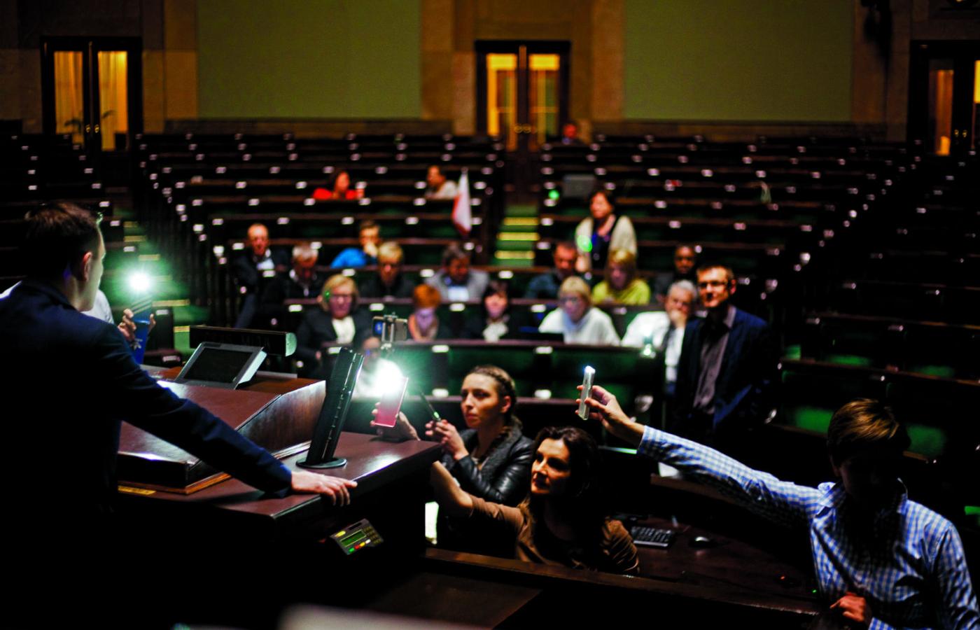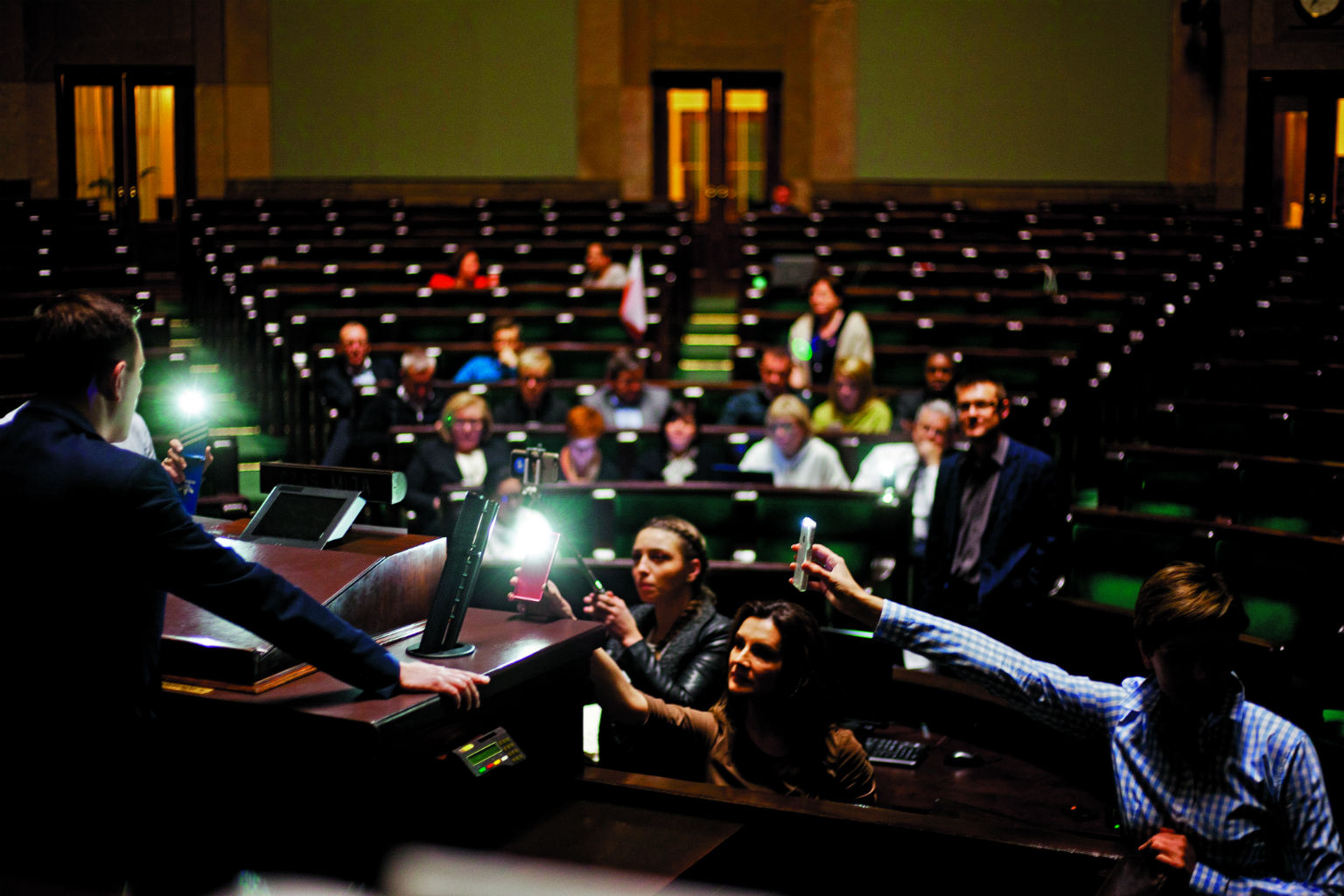 Siedzą zawsze na swoich miejscach, jakby trwało posiedzenie, tyle że owinięci kocami. Czytają w świetle małych chińskich lampek campingowych, podobnie jak okrycia kupionych przez klub PO. Światło wyłączono im razem z ogrzewaniem, więc nawet w dzień panuje tu półmrok. By temperatura się nieco podniosła, wpuszczają ogrzane powietrze z korytarza, blokując drzwi krzesłem.