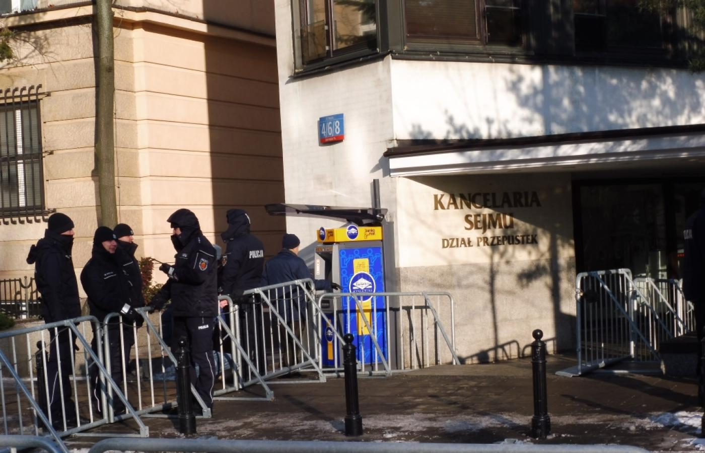 Tymczasem policja rozstawiła wokół budynku Sejmu barierki. Dojazdu do Sejmu ze wszystkich stron pilnują policjanci. Po ulicy Wiejskiej samochodami mogą się poruszać tylko parlamentarzyści i członkowie rządu. W gmachu Sejmu widać bardzo wielu funkcjonariuszy BOR i wzmożoną czujność Straży Marszałkowskiej. Strażnicy zwracają dziennikarzom uwagę, by nosili przepustki sejmowe w widocznym miejscu.