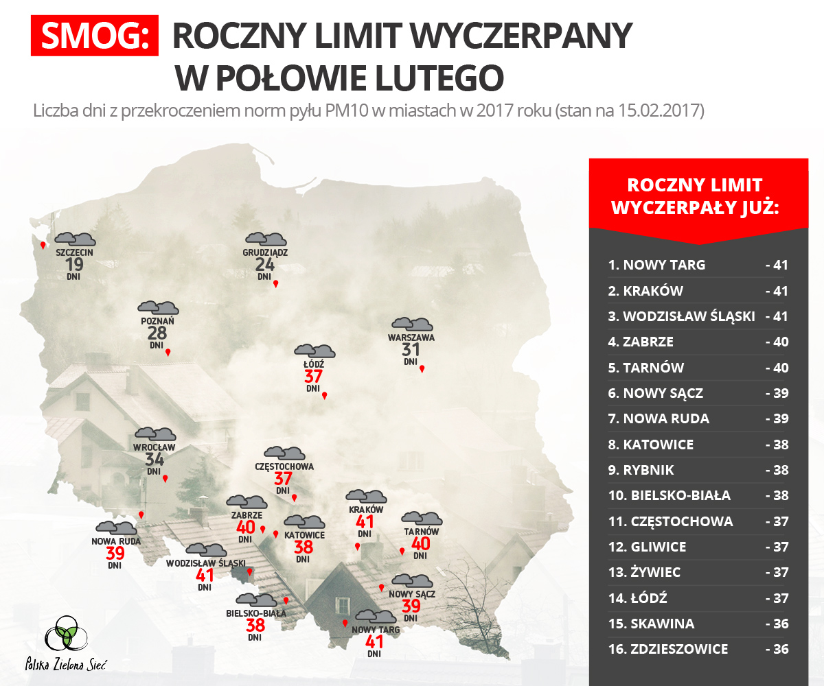 Od początku roku minęło zaledwie półtora miesiąca, a 16 polskich miast już przekroczyło roczny limit norm jakości powietrza. A to oznacza, że są w Polsce miejsca, gdzie w sezonie grzewczym dopuszczalne limity przekraczane są praktycznie bez przerwy.