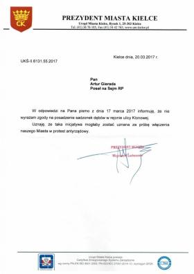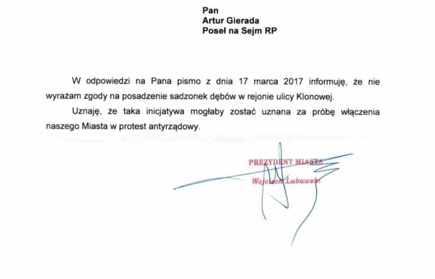 Jednak prezydent Kielc Wojciech Lubawski pokonał wszystkich poprzedników, jak to ma w zwyczaju, już w pierwszej turze. Prezydent, poproszony przez świętokrzyskiego posła PO Artura Gieradę o zgodę na posadzenie drzew, konkretnie czterech dębów, odmówił jej zdecydowanie. Jego zdaniem sadzenie drzew w mieście jest wykluczone. Może być bowiem uznane za „protest antyrządowy”.