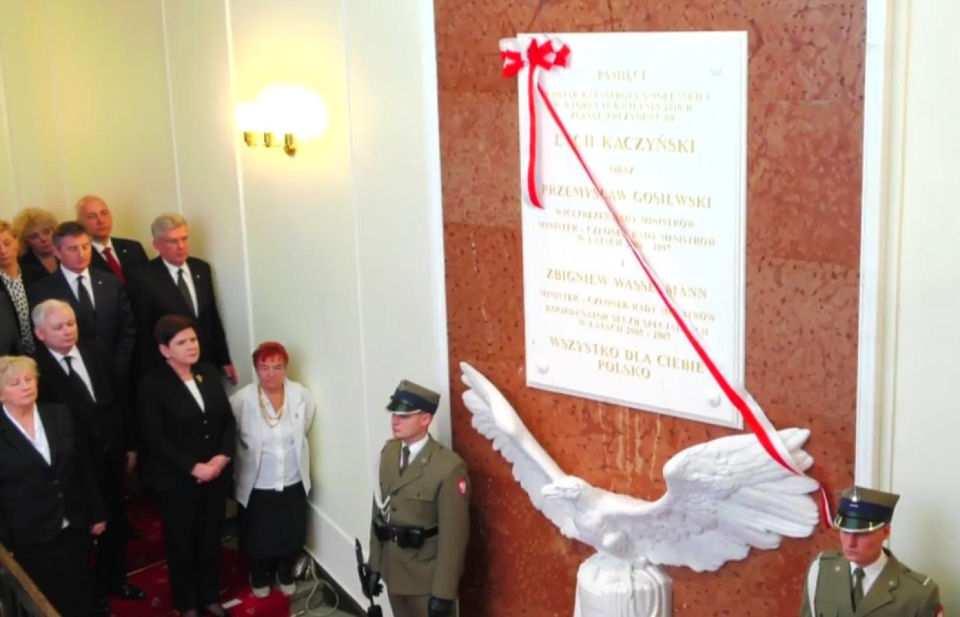 Odsłonięcie tablicy poświęconej pamięci prezydenta Kaczyńskiego, byłego wicepremiera Gosiewskiego i byłego ministra ds. służb specjalnych nie zostało ujęte w harmonogramie państwowych uroczystości. Zaproszenia dotarły na Nowogrodzką – do siedziby PiS – do najważniejszych polityków partii i współpracowników tych, których nazwiska wyryto na tablicy.