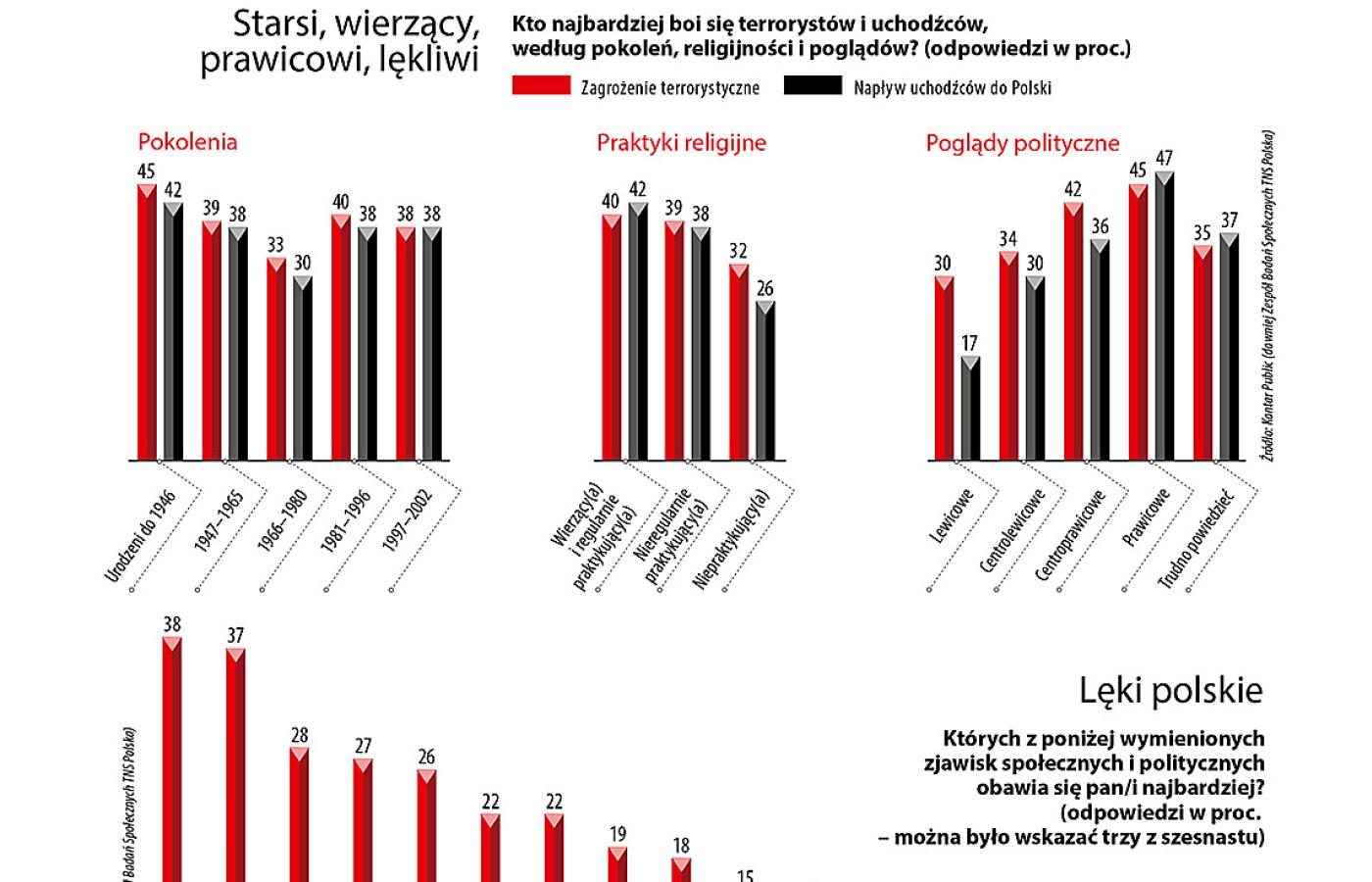 Zamachów terrorystycznych obawia się 38 proc. z nas. Napływu uchodźców tylko jeden procent mniej. Wygląda, że jest tu swoisty znak równości. Wizja nowej wojny niepokoi 28 proc. pytanych. W kwietniu ośrodek badawczy Kantar Public na zlecenie POLITYKI poprosił ponad tysiąc Polaków o wybranie trzech z listy szesnastu zjawisk społecznych, które budzą ich najsilniejsze obawy (nie pytaliśmy o naturalne lęki osobiste, egzystencjalne, jak choroba, niepełnosprawność, śmierć bliskiej osoby itd.). Po uchodźcach i wojnie na liście strachów Polacy umieścili lęki o byt materialny: zubożenie na starość, utratę pracy, o przyszłość rodziny i dzieci. Bardzo się tym martwi około jednej czwartej pytanych. Rządy PiS niepokoją prawie dwa razy więcej obywateli (22 proc.) niż ewentualność powrotu do władzy Platformy Obywatelskiej (wskazana przez 12 proc.).