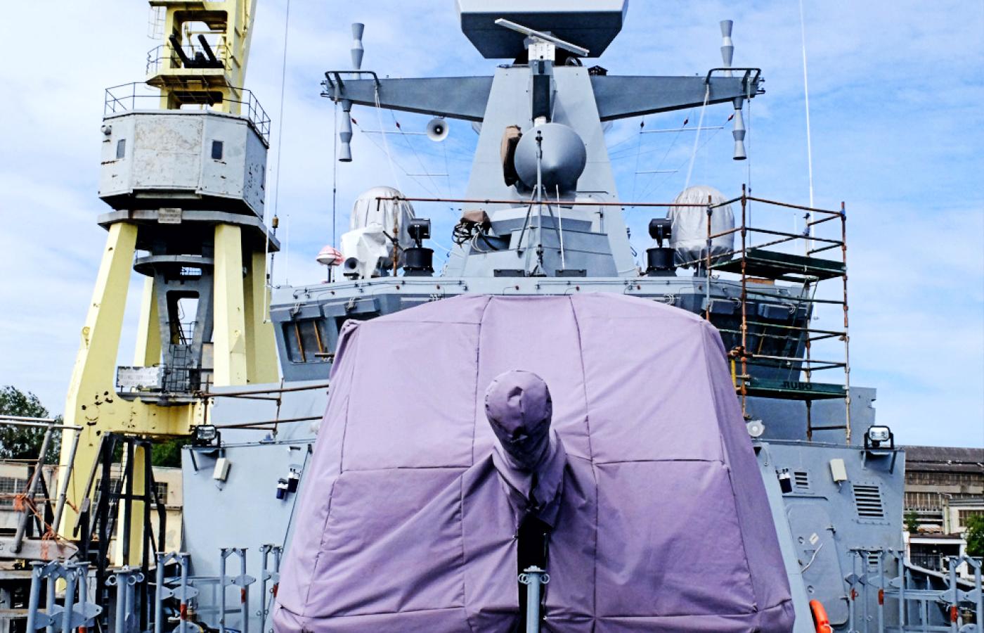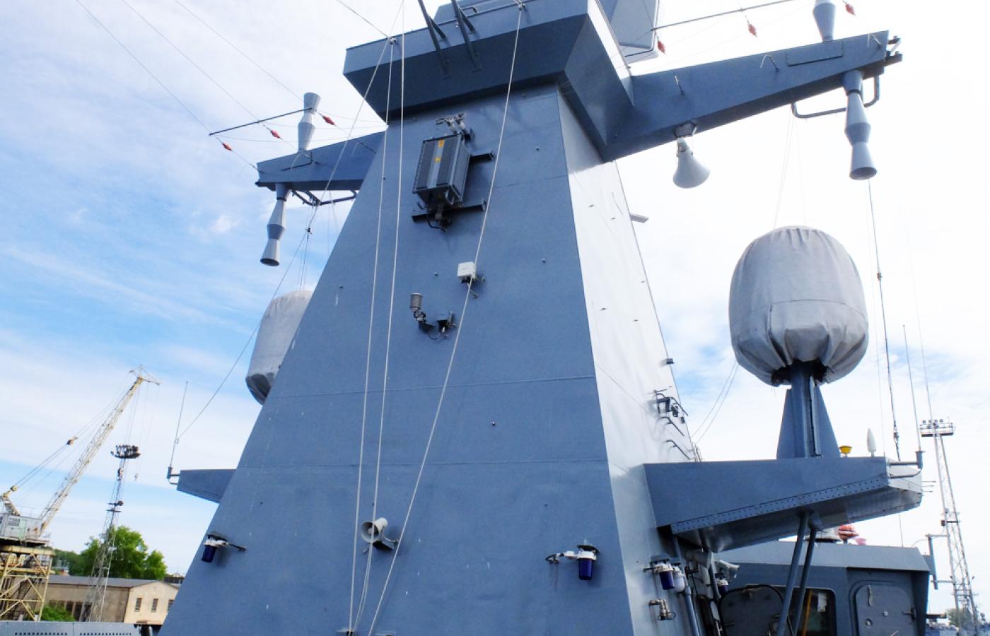 Niedawno zakończono montaż uzbrojenia pokładowego i anten na masztach, okręt zaczyna więc wyglądać „rasowo”. Główna dziobowa armata kalibru 76 mm, na razie szczelnie przykryta, pozostanie prawdopodobnie najgroźniejszym uzbrojeniem okrętu, który przecież miał być w założeniu również nosicielem rakiet przeciwokrętowych i przeciwlotniczych.