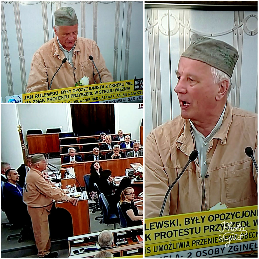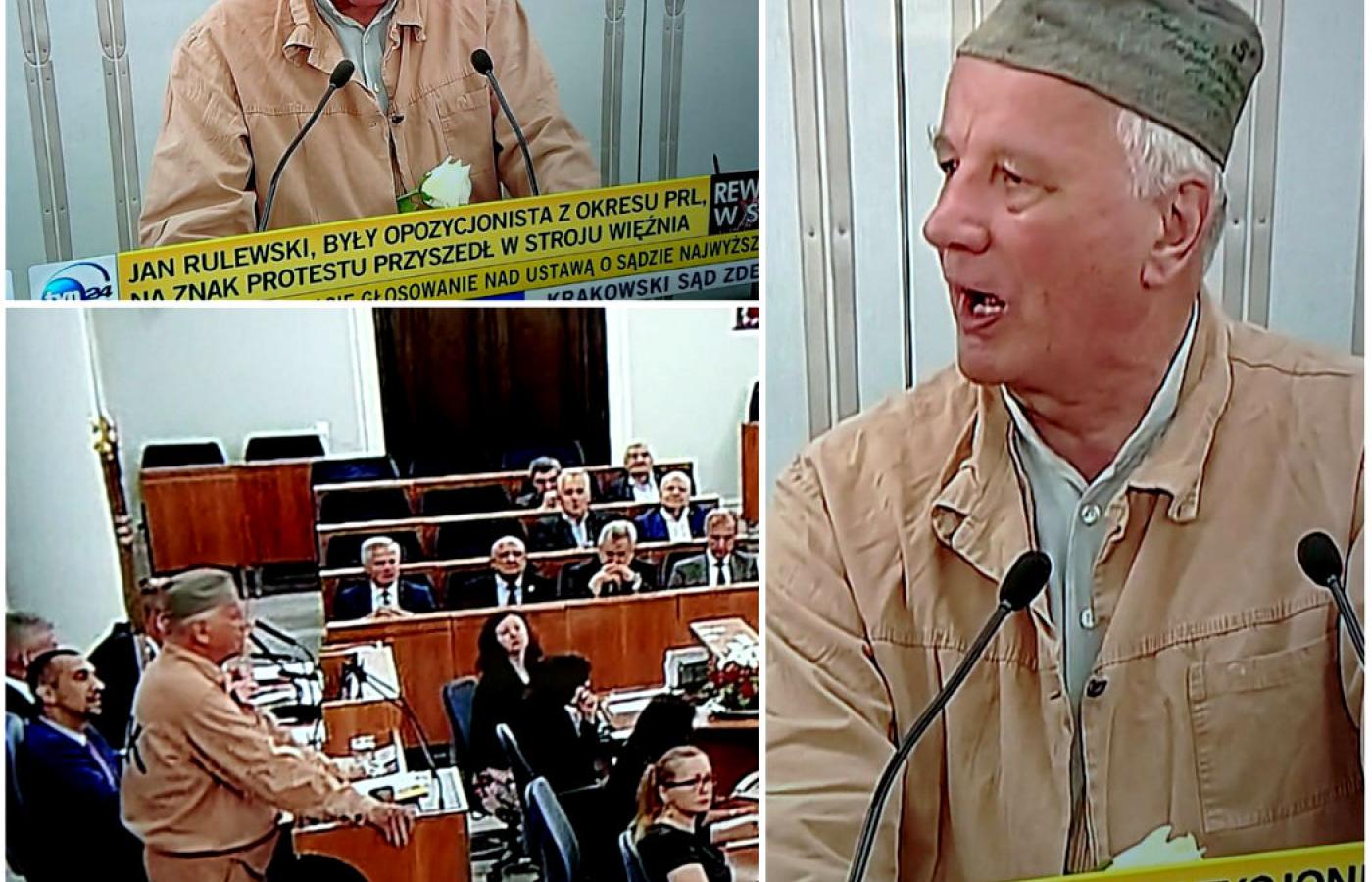 Na piątkowe obrady Senatu Jan Rulewski przyszedł w więziennym drelichu i z białą różą. „Ten strój jest jak najbardziej adekwatny do tego, co się dzieje w Polsce. Nasz kraj przekształca się systematycznie w zakłady karny” – wyjaśniał dziennikarzom. Z kolei białą różę prezes Jarosław Kaczyński uważa za znak nienawiści.