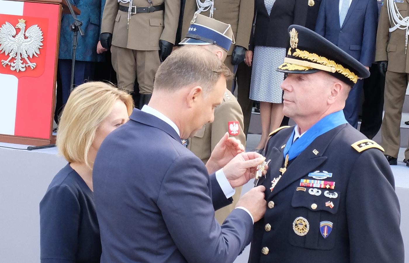 Podkreśleniem ścisłej współpracy z Amerykanami był nie tylko przemarsz ich kompanii i przelot trzech śmigłowców w defiladzie powietrznej. Przed uroczystością prezydent Andrzej Duda odznaczył Orderem Zasługi odchodzącego ze stanowiska dowódcę Sił Lądowych USA w Europie (US Army Europe), trzygwiazdkowego generała Fredericka „Bena” Hodgesa. Hodges jak mało kto przyczynił się do obecności w Polsce amerykańskich wojsk i jest jednym z architektów wysuniętej obecności sił NATO w całym regionie. Przy okazji Andrzej Duda ujawnił nie znany do tej pory fakt, że odbył z generałem rozmowę w cztery oczy w czasie zeszłorocznych ćwiczeń Anakonda. Mogła być ona ważnym elementem kampanii na rzecz zatwierdzenia przez zbliżający się wtedy szczyt NATO korzystnych dla Polski decyzji.