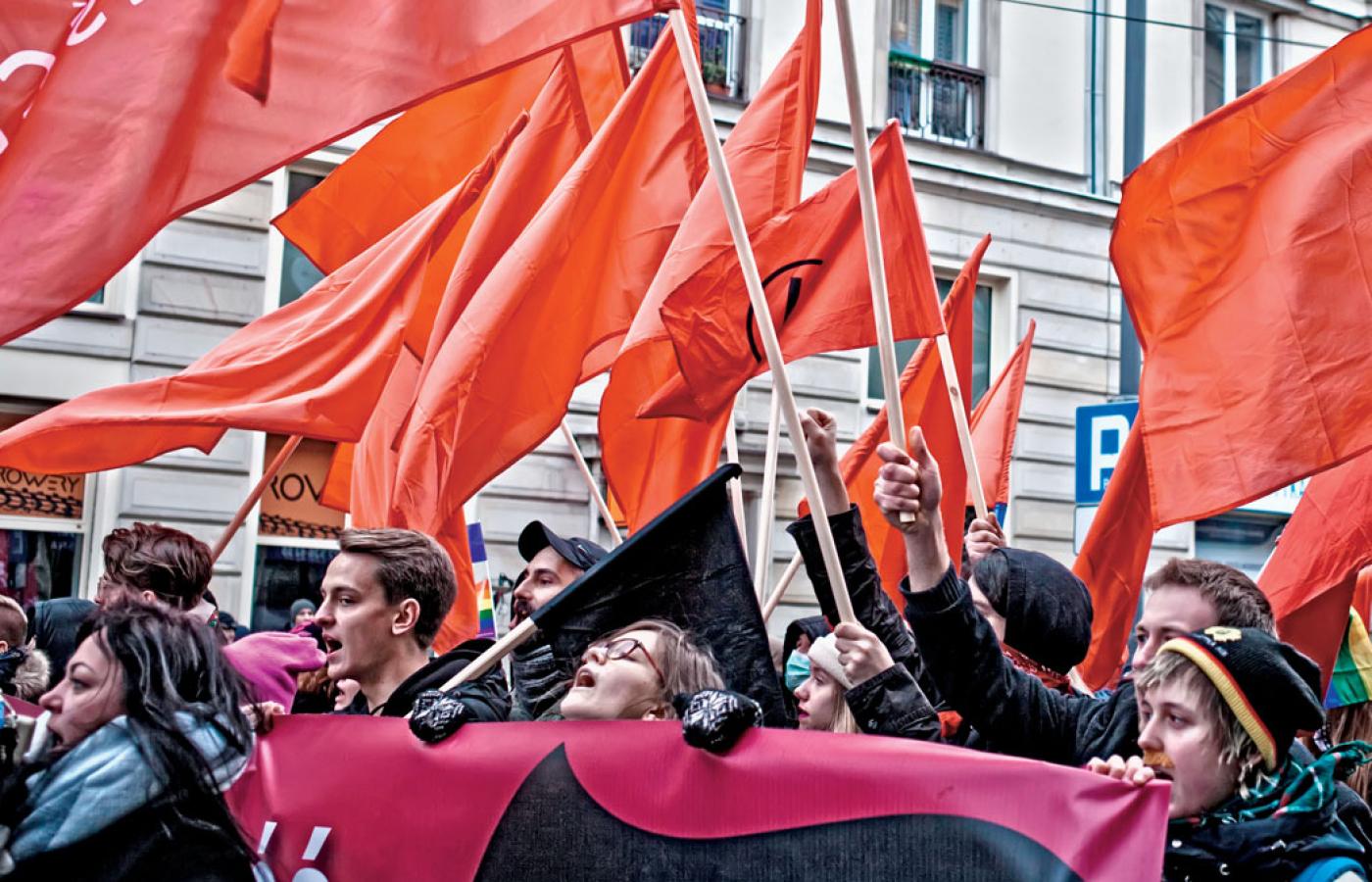 Wokół kościoła kręcili się faceci w pomarańczowych kamizelkach: straż ochrony marszu. To oni przejęli funkcje quasi-policyjne na terenie Rzeczpospolitej nacków. Wyglądali jak obywatelska milicja. Odbywało się coś w rodzaju odprawy. „Oficerowie” podawali „szeregowym” wytyczne. „Dziś nie ma tylu batonów co wcześniej” – informowano się z radością. Kawałek dalej śmiano się z kolesia, który przyszedł ochraniać marsz nie w glanach, ale w leciutkich półbucikach ze szpicem. W ogródku kościoła stali rekonstruktorzy w rogatywkach, przedwojennych mundurach. Popularne były kożuszki narzucane na mundur zamiast wojskowych płaszczy, spięte grubym pasem.