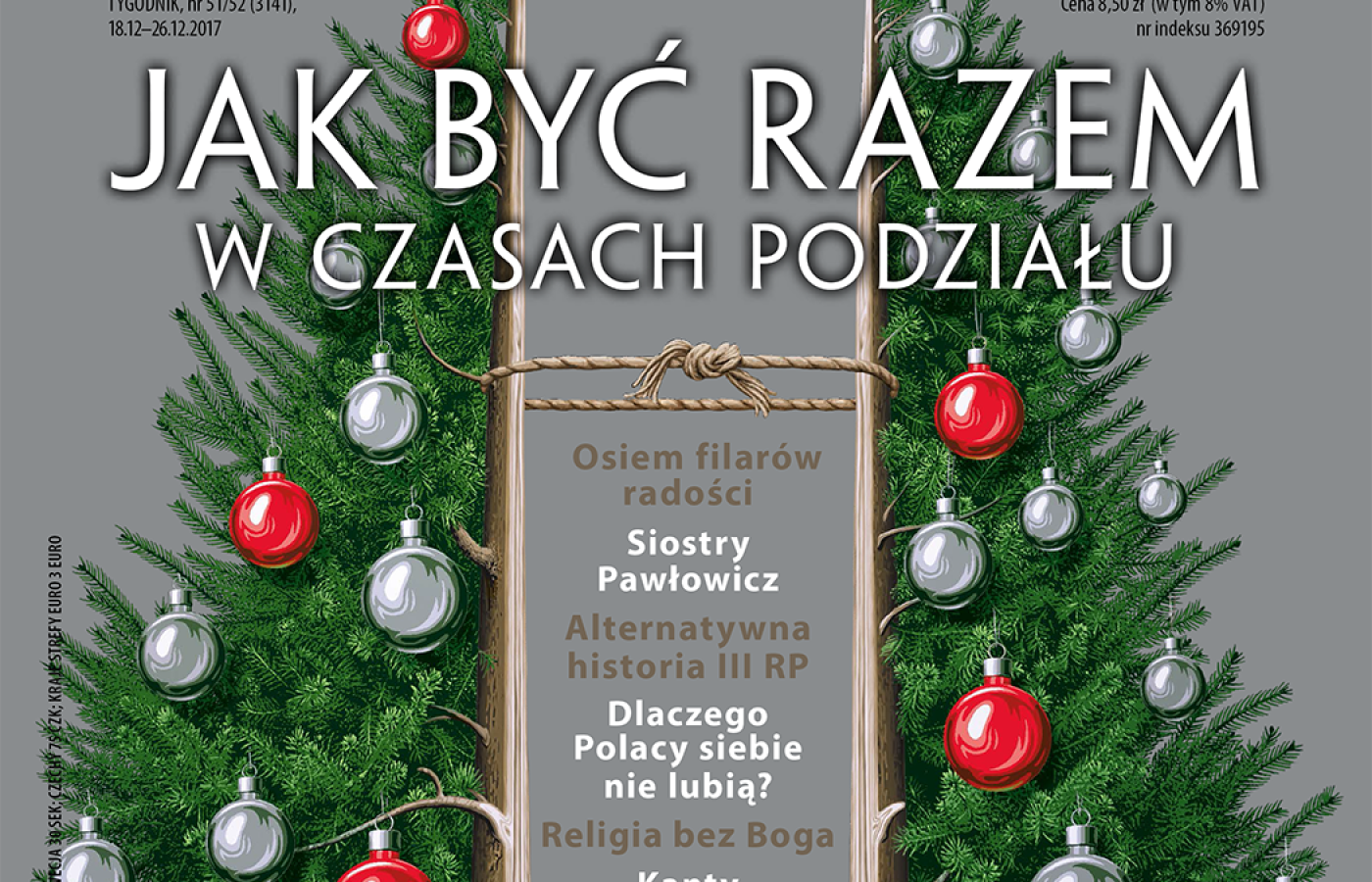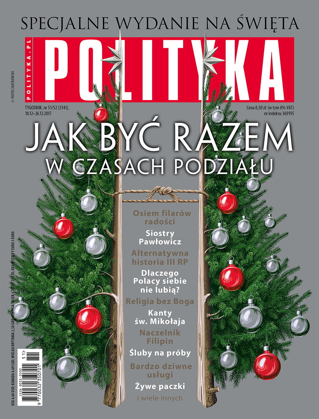Rafał Kalukin opisuje stan politycznej gry na koniec 2017 roku, pytając, w jakim miejscu znalazło się polskie życie publiczne, dokąd zmierza władza, gdzie są jej przeciwnicy i jaka jest mentalna kondycja głęboko podzielonego społeczeństwa. Anna Dąbrowska przedstawia dwie siostry, które znalazły się na dwóch ideowych biegunach: Krystynę i Elżbietę Pawłowicz. Pierwsza z nich jest bezpardonową bojowniczką PiS, a druga chodzi na protesty KOD i niedawno robiła zbiórkę pieniędzy dla Mateusza Kijowskiego. Niezwykle ciekawa to historia.