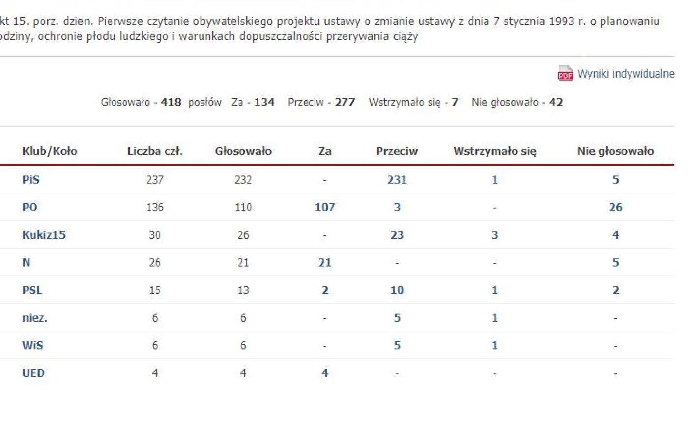 Przeciwko odrzuceniu projektu zaostrzającego przepisy aborcyjne było 277 posłów, 134 chciało odrzucenia go w pierwszym czytaniu. W wyniku tego głosowania projekt trafi do sejmowej komisji polityki społecznej i rodziny.