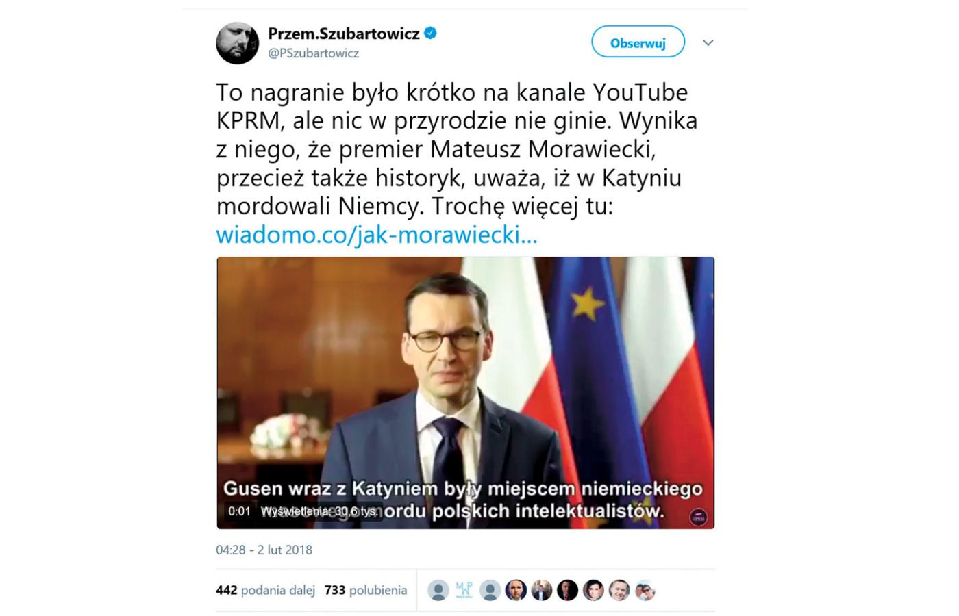 Orędzie Mateusza Morawieckiego w obronie noweli ustawy o IPN przejdzie do historii z innych powodów, niż mówca sobie życzył. Aktualnie Kancelaria Premiera pokazuje na YouTube trzy warianty tego wystąpienia: wygłoszone po polsku, po angielsku i raz jeszcze po angielsku, tyle że krótsze (za to obficie zilustrowane). Wersje niefortunne, transmitowane z napisami, zostały skasowane, ale w sieci nic nie ginie. Tymczasem wpadka w tłumaczeniu była kolosalna i trafiła się premierowi w newralgicznym punkcie przemówienia. Oto widzowie z zagranicy, jedni z adresatów oświadczenia, dowiedzieli się, że „camps where millions of Jews were murdered were Polish” (Obozy, w których wymordowano miliony Żydów, były polskie). Błąd okazał się wynikiem „automatycznego tłumaczenia serwisu YouTube” – wyjaśniła Kancelaria na Twitterze. Przedstawiciele YouTube okazali skruchę, ale i wyświadczyli premierowi przysługę, bo wpadka w orędziu zdarzyła się jeszcze jedna, poważniejsza, i można ją było przy okazji wykasować. W finalnej wersji filmu nie ma więc kompromitującego fragmentu, w którym Mateusz Morawiecki obwinia Niemców o zamordowanie przedstawicieli polskiej inteligencji... w Katyniu. Trudno o lepszą puentę dla wygłoszonej wcześniej deklaracji, że rząd PiS nie będzie tolerował żadnych historycznych przekłamań.