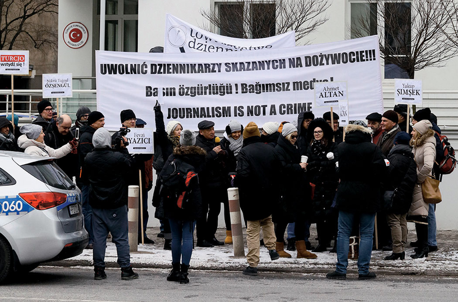 Podczas demonstracji Konstanty Gebert przypomniał słowa prezydenta Recepa Tayyipa Erdoğana, który sam siebie uważa za obrońcę wolności słowa – co w tym kontekście brzmiało niezwykle gorzko. – Bądźmy z nimi solidarni i pamiętajmy o nich! – apelował redaktor naczelny POLITYKI Jerzy Baczyński. Protestujący podpisali również petycję w sprawie skazanych. Złożyli ją na progu ambasady, ponieważ żaden z przedstawicieli nie chciał jej przyjąć.