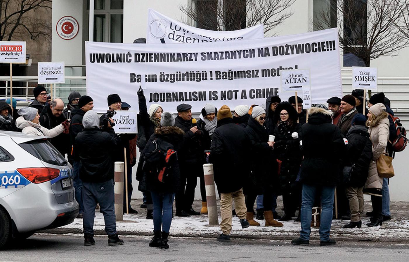 „Wstydź się Turcjo!”, „Uwolnić dziennikarzy skazanych na dożywocie” – z takimi m.in. transparentami zebrała się w poniedziałek pod ambasadą Turcji, na wezwanie Towarzystwa Dziennikarskiego, grupa kilkudziesięciu polskich dziennikarzy, w tym przedstawicieli POLITYKI. Chodziło o wsparcie tureckich dziennikarzy, których stambulski sąd skazał na dożywocie – bez możliwości apelacji. Oficjalnie za udział w próbie zamachu stanu w lipcu 2016 r. i medialne wsparcie Fetullaha Gülena, islamskiego kaznodziei mieszkającego w USA, któremu przypisuje się zorganizowanie puczu. Prokurator uznał też, że trójka ze skazanych podczas jednego z wywiadów telewizyjnych dawała „podprogowe sygnały” zachęcające do zamachu stanu.