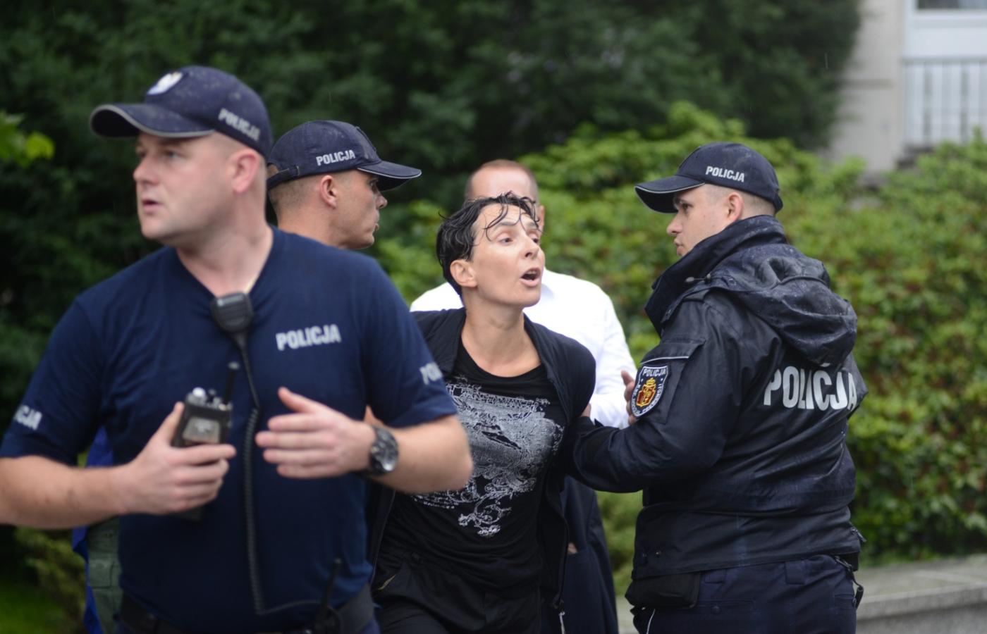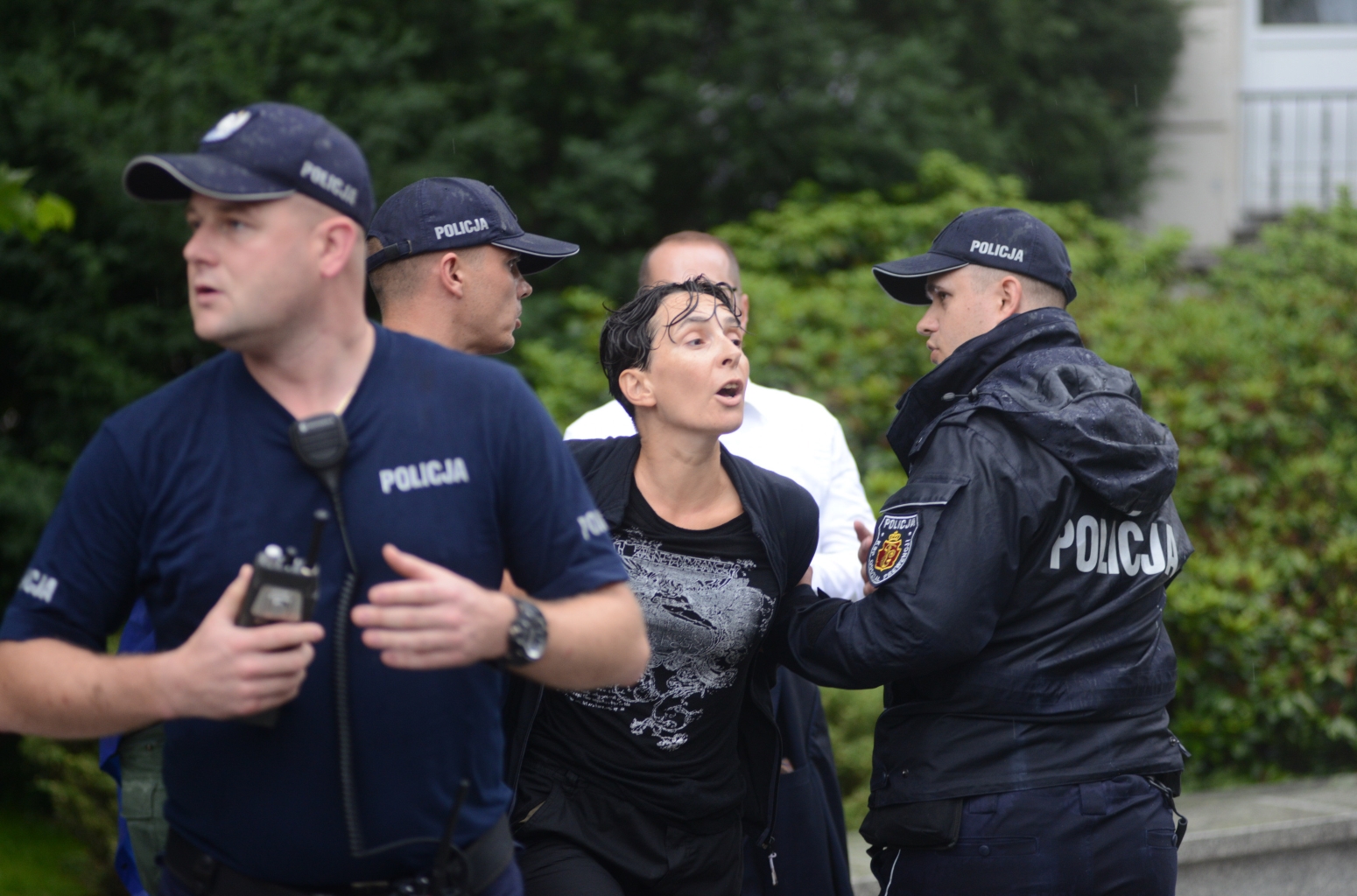 Zaczęła się ulewa. Poszedł czerwony dym, dwie osoby stanęły ze „szmatą”. Napis był skierowany do PiS, ale zdenerwował też byłego kolegę z „opozycji”, zeszłorocznego inicjatora i promotora „nieposłuszeństwa obywatelskiego”, który opieprzył młodzież za wulgaryzmy. A reszta wbiegła na zakazany i najbardziej strzeżony kawałek trawnika w całym kraju. Koleżanka dobiegła do muru budynku sejmowego i na niebiesko (kolor, którego trzeba będzie niedługo zakazać) napisała: „Czas na sąd”. Mnie i innych wyłapano, z tym że odstawiona na Wiejską i pozostawiona sama sobie, postanowiłam skorzystać z wolności i na budynku od Wiejskiej napisałam to samo. Nie zdążyłam tylko dopisać „d” na końcu, gdy policja wyrwała sprej i w sile sześciu chłopa na moje 50 kg wagi wykręciła mi ręce do tyłu i nałożyła kajdanki. Nadmienię, że na tym budynku zawsze od groma graffiti Legii i innych klubów. Oburzenie drobnomieszczan, że mur pobrudziłam, wyłącznie mnie śmieszy. Jeśli chcą raka leczyć witaminą C, to niech to robią na swoją odpowiedzialność i na swoim organizmie.