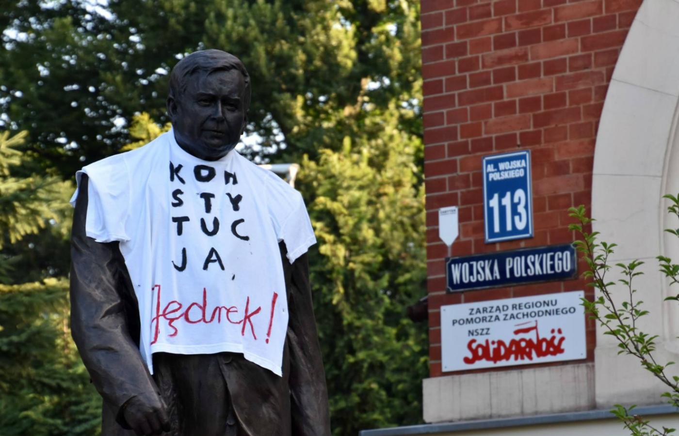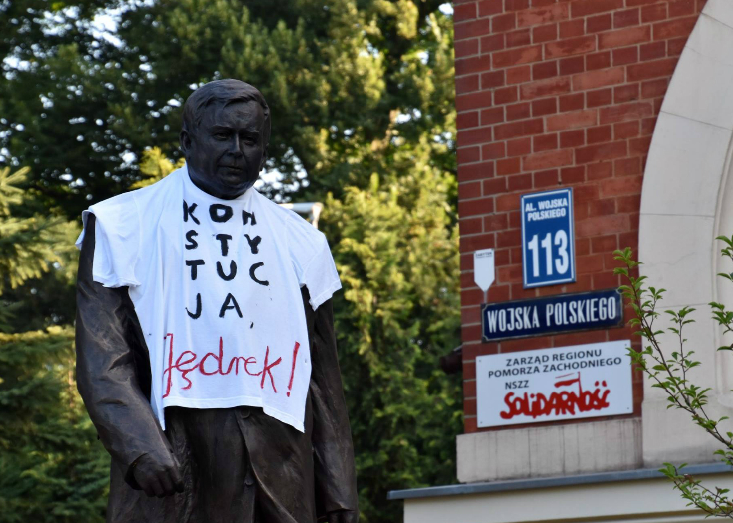 Zawieszenie na niedawno odsłoniętym w Szczecinie pomniku Lecha Kaczyńskiego koszulki z napisem „Konstytucja, Jędrek!” skutkuje postawieniem na nogi miejscowej policji z zadaniem ujęcia sprawcy. Czyn wstępnie zakwalifikowano jako znieważenie pomnika lub innego miejsca publicznego. To znowu przestępstwo, za które kodeks karny przewiduje grzywnę lub ograniczenie wolności do 2 lat.
