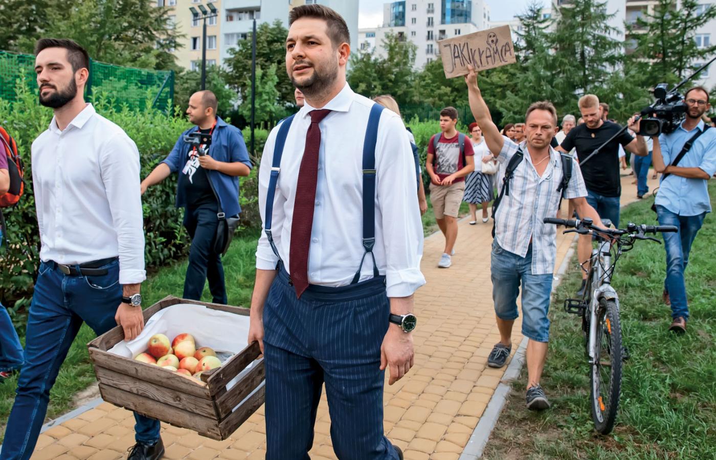 Już za chwilę Patryk Jaki kolejny raz stanie pod blokiem. Ulotki gotowe, skrzynka z jabłkami stoi na chodniku. Partyjny aktyw od dobrego kwadransa już w gotowości. Drepcze kilkoro oddanych fanów, stale towarzyszących kandydatowi w jego wędrówkach po mieście. I jeszcze młodzi ludzie z telefonami na wysięgnikach, którzy zarejestrują wydarzenie i wrzucą do sieci.