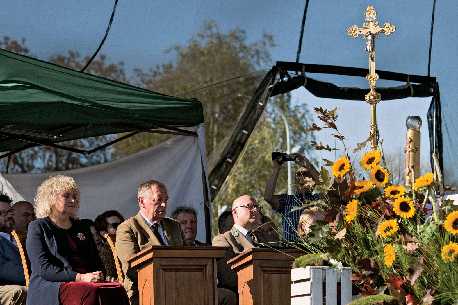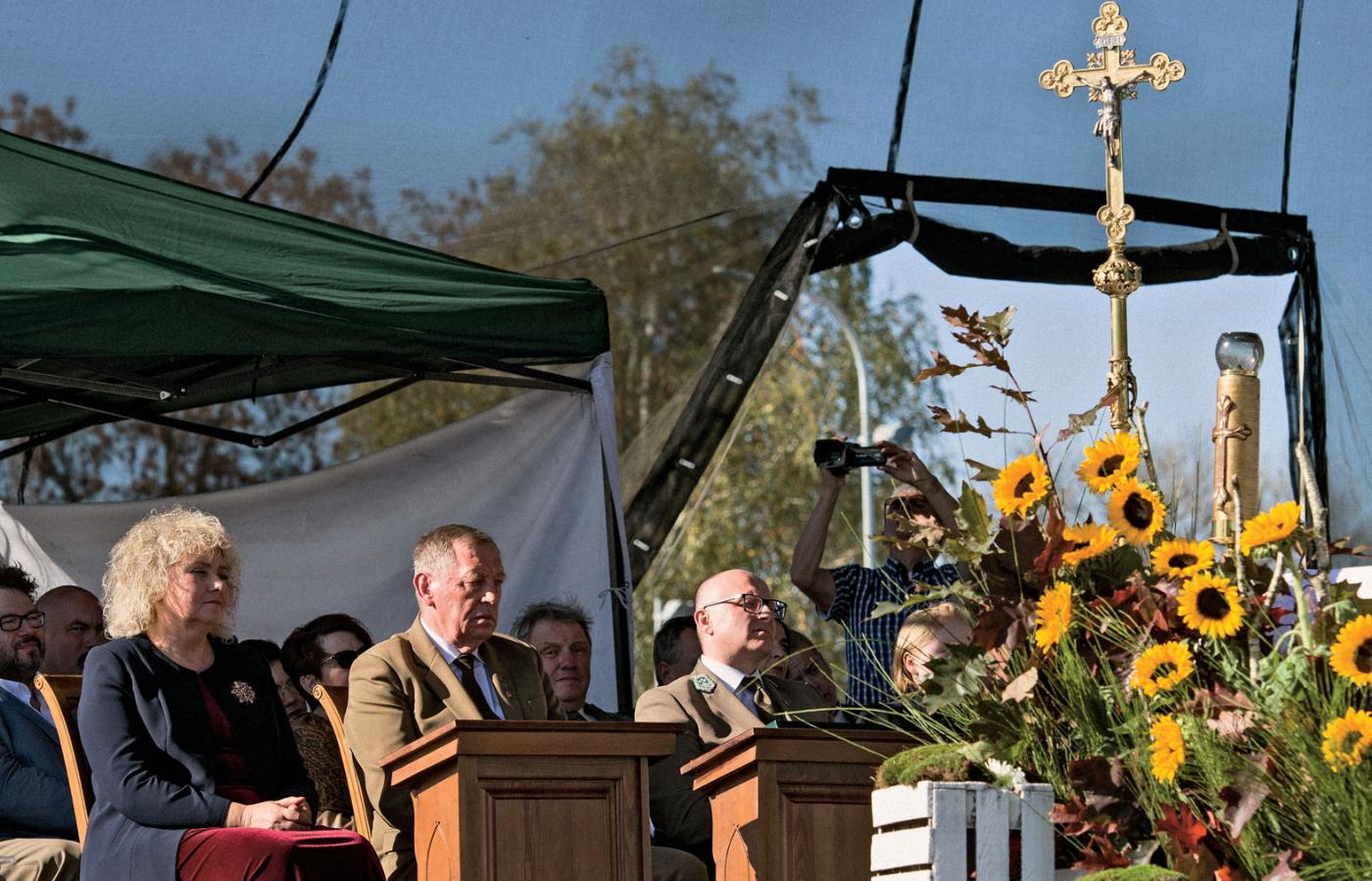 Wokół stały dziesiątki, jeśli nie setki, umundurowanych leśników, w bardzo pięknych galowych uniformach, nad sceną, na której – na przemian – odbywały się to przemówienia, to obrzędy religijne – wisiało wielkie zdjęcie przedstawiające jakiegoś dżentelmena w czapeczce myśliwskiej wraz z rodziną (ze sceny często podkreślano, jakby wyzywająco wobec dzisiejszych czasów, że Hubertus to święto rodzinne). Na prawie całej szerokości sceny siedzieli księża w odpowiednich na okazję, zielonych tunikach, w pozach pełnych dostojeństwa.