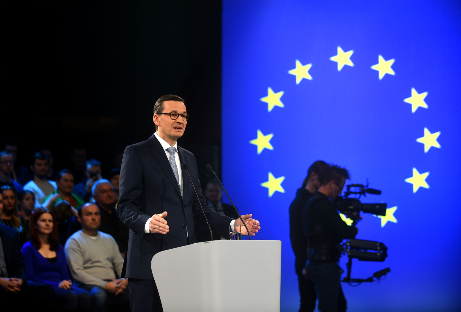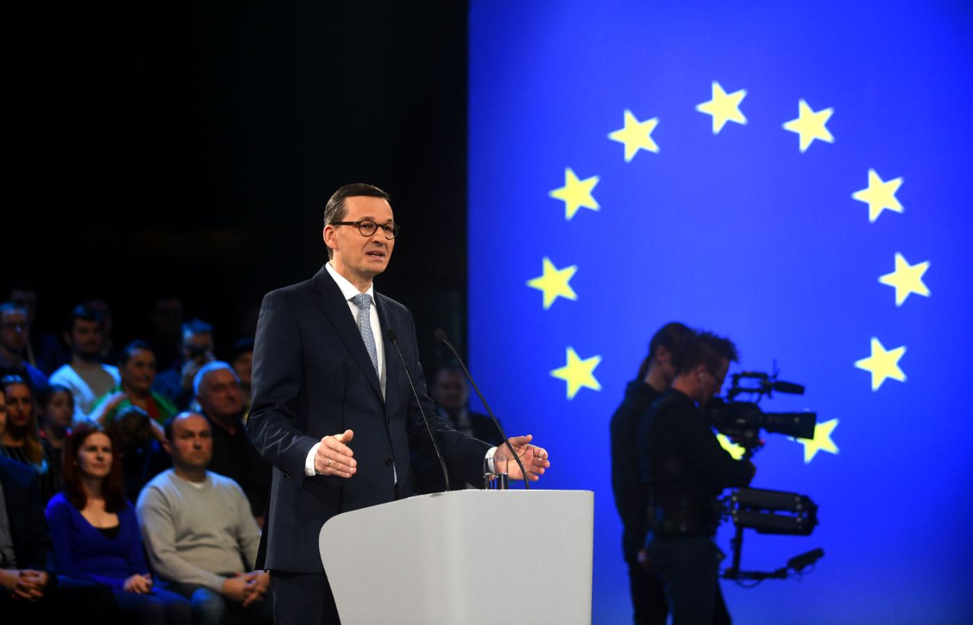Morawiecki zapewnił, że nie, absolutnie PiS nie wyprowadzi Polski z Unii i tak, na pewno na 500+ pieniędzy nie zabraknie, nawet jak koniunktura się pogorszy. Żeby podkreślić proeuropejskie nastawienie PiS, na sali wisiały telebimy z polskimi i unijnymi flagami. Na ich tle przemawiała w sobotę m.in. Beata Szydło, która gdy została premierem w 2015 r., kazała zdjąć flagi unijne z sali, w której odbywały się rządowe konferencje prasowe.
