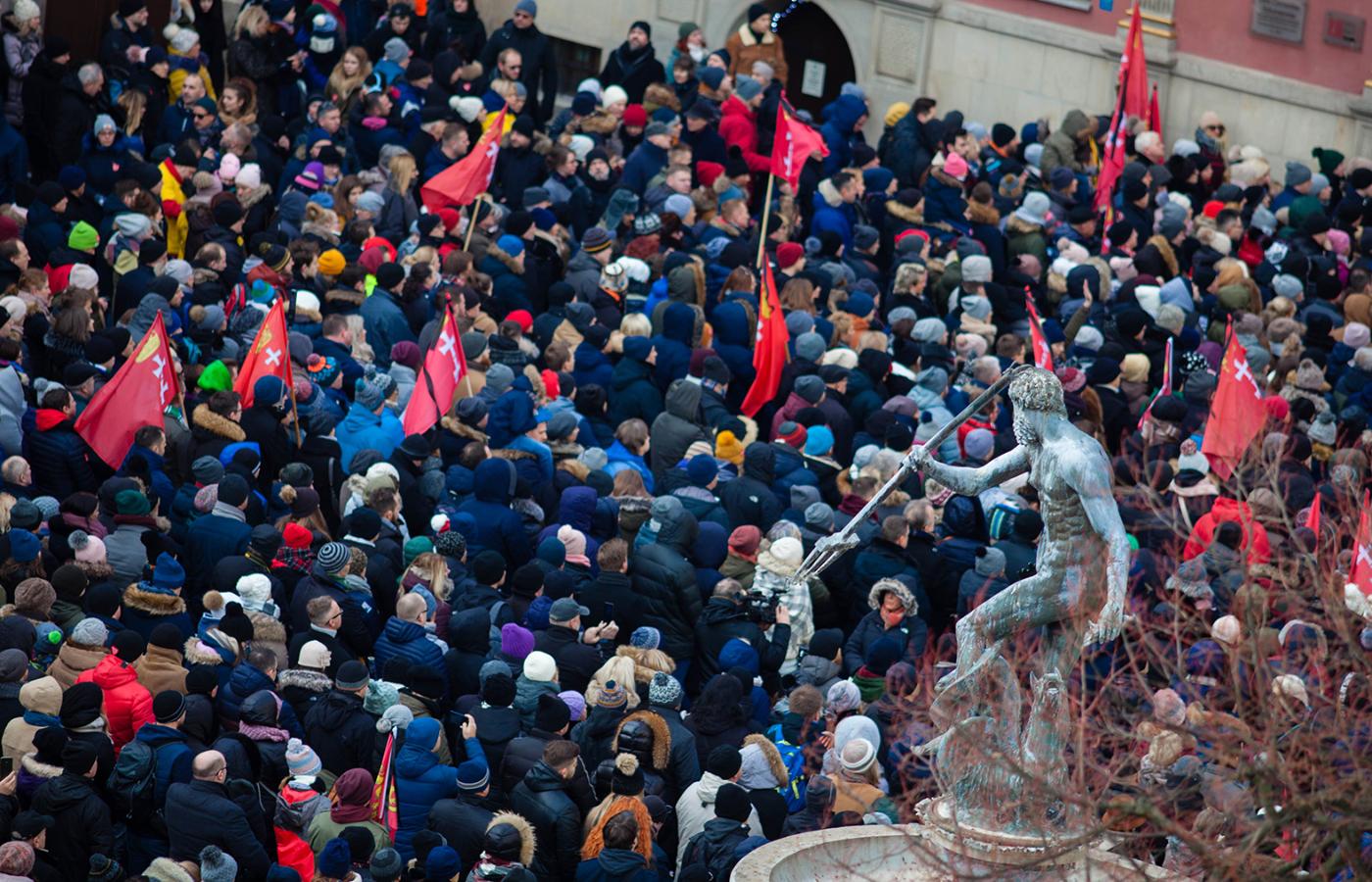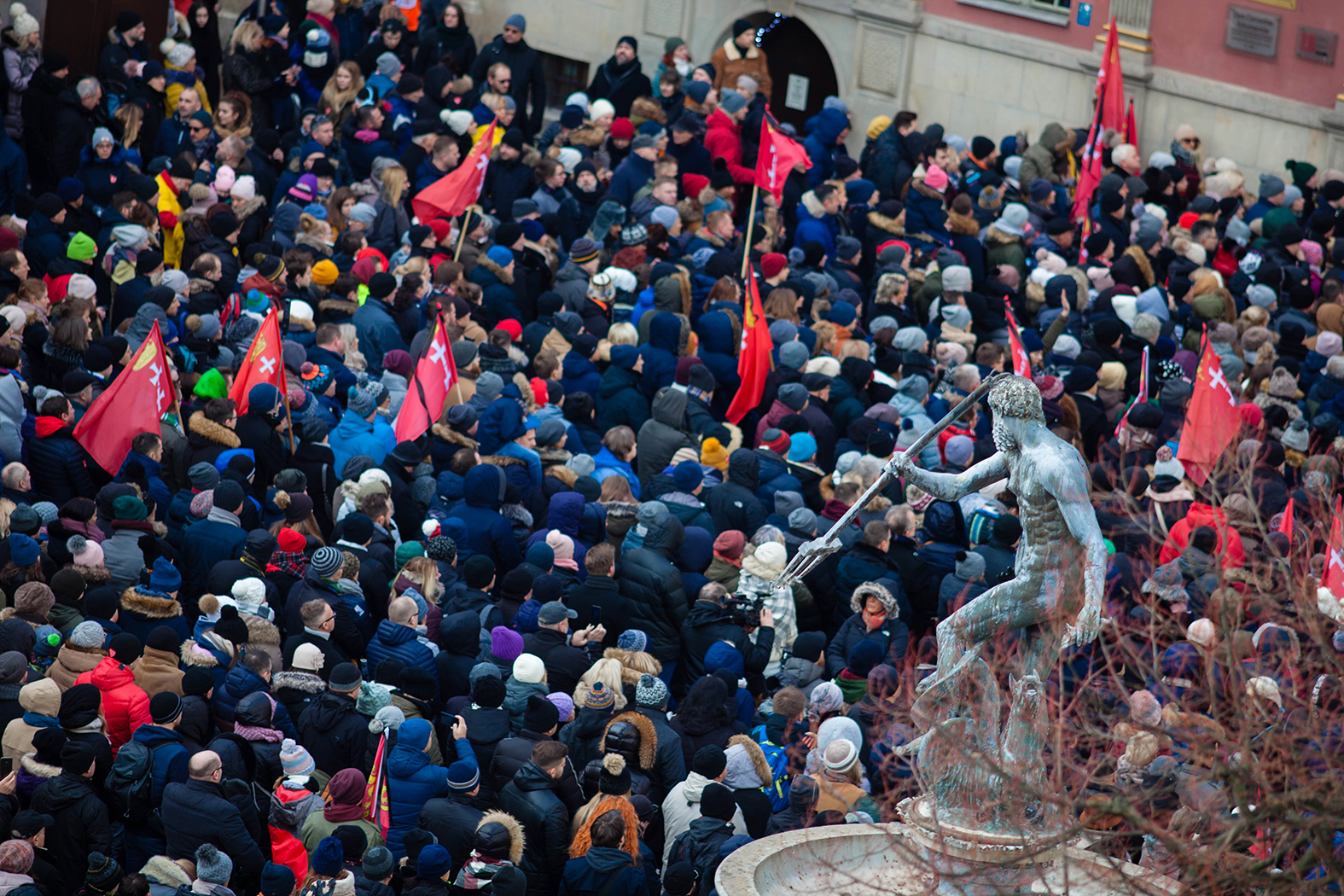 Zebrani opowiadają sobie, jak wczoraj, w piątek, stali na trasie pogrzebowego konduktu. Wyruszył z Europejskiego Centrum Solidarności, mijał miejsca ważne w życiorysie zabitego prezydenta: kościół św. Mikołaja, gdzie był ochrzczony, dom rodzinny, szkoły, do których chodził. Jak w środę na pl. Solidarności czekali na swą kolej, by w „największym sercu świata” ustawić swój znicz. Student historii UG przyznaje, że jego pokolenie do tej pory było politycznie bierne, ale teraz sam widzi mocne ożywienie wśród rówieśników i ma nadzieję, że nie będzie to chwilowe. Kobieta w średnim wieku mówi o swoich córkach florecistkach i nagrodzie za wyniki, jaką w 2018 r. wręczył im Adamowicz. Młody facet w długim płaszczu zapewnia, że przyjechałby tu nawet z 40-stopniową gorączką, bo ten pogrzeb – „to wydarzenie historyczne – jest jak pożegnanie Martina Luthera Kinga”. Nad tłumem powiewają flagi Gdańska z czarną wstążeczką, starsza pani rozdaje nalepki z wypisanym czarną solidarycą imieniem i nazwiskiem prezydenta. Co chwila ktoś przystaje i wrzuca datek do puszki wolontariuszy – rodzina prezydenta prosiła, by zamiast kwiatów i zniczy wesprzeć bliskie Adamowiczowi fundacje: Hospicjum i WOŚP.