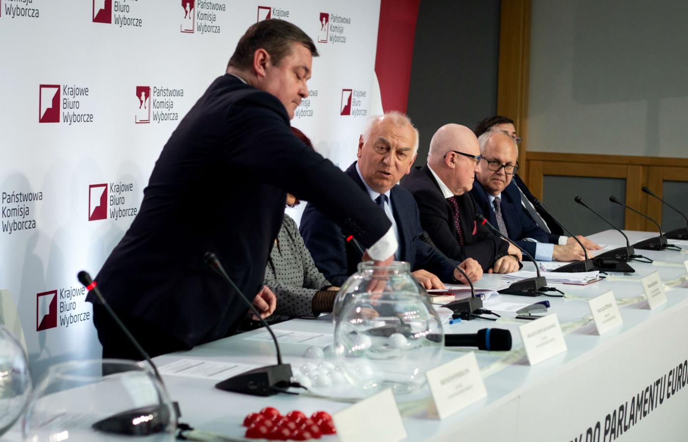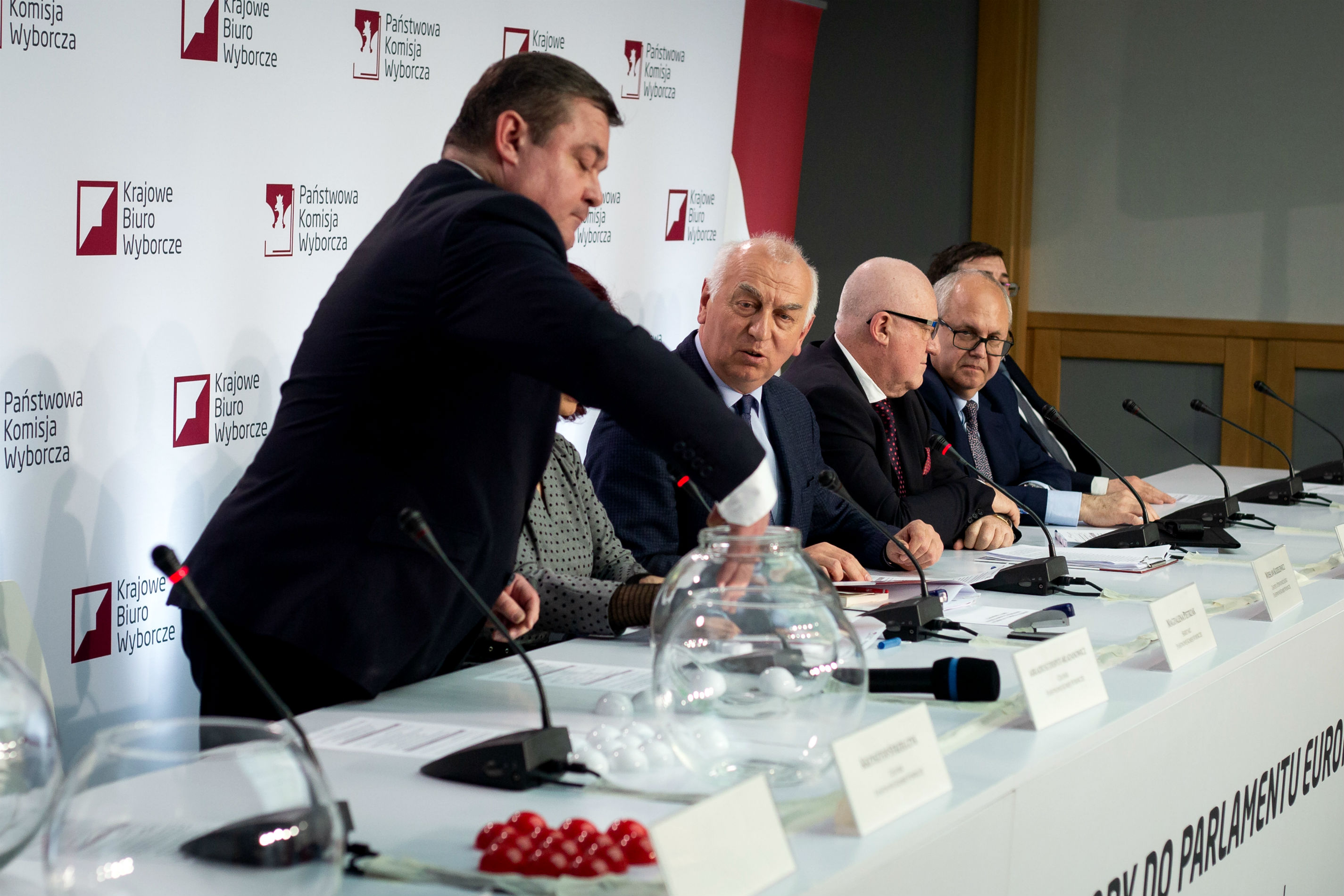 Ceremonia przypomina teleturniej z lat 90. Za stołem siedzi sześcioro przedstawicieli PKW, przed nimi szklane bańki z plastikowymi kulkami jak z jajek niespodzianek. Znajdujące się w „jajkach” numery losują dla poszczególnych komitetów przypadkowe, wskazane przez przewodniczącego komisji osoby z sali. I tak np. numer czwarty dla PiS wylosował Marcin Kierwiński, szef sztabu Koalicji Europejskiej.