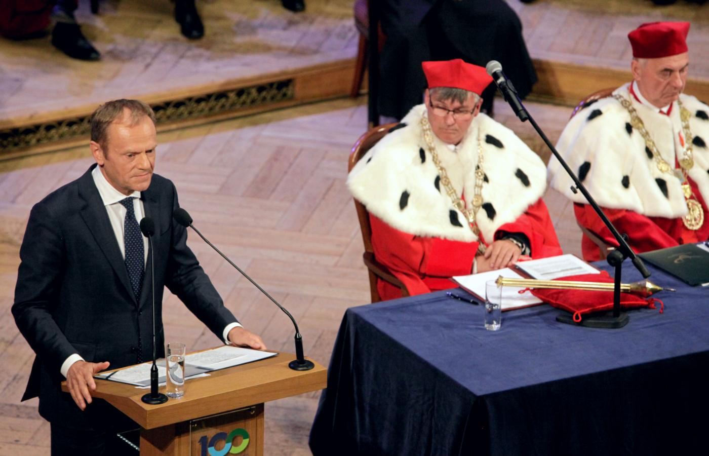 Uniwersytety to przestrzeń publiczna, bez której tak naprawdę żadna demokracja nie jest w stanie przetrwać. Polska będzie wolnościową demokracją, taką, o jaką walczyliśmy, póki nikt nikogo nie będzie straszył, prześladował, więził za przekonania, ekspresję myśli czy artystyczną wrażliwość – mówił w Poznaniu Donald Tusk, przewodniczący Rady Europejskiej. Tusk przyjechał na zaproszenie czterech poznańskich uczelni wyższych, które obchodziły setną rocznicę powstania Uniwersytetu Poznańskiego. W auli Uniwersytetu im. Adama Mickiewicza w Poznaniu wygłosił kilkunastominutowe wystąpienie.