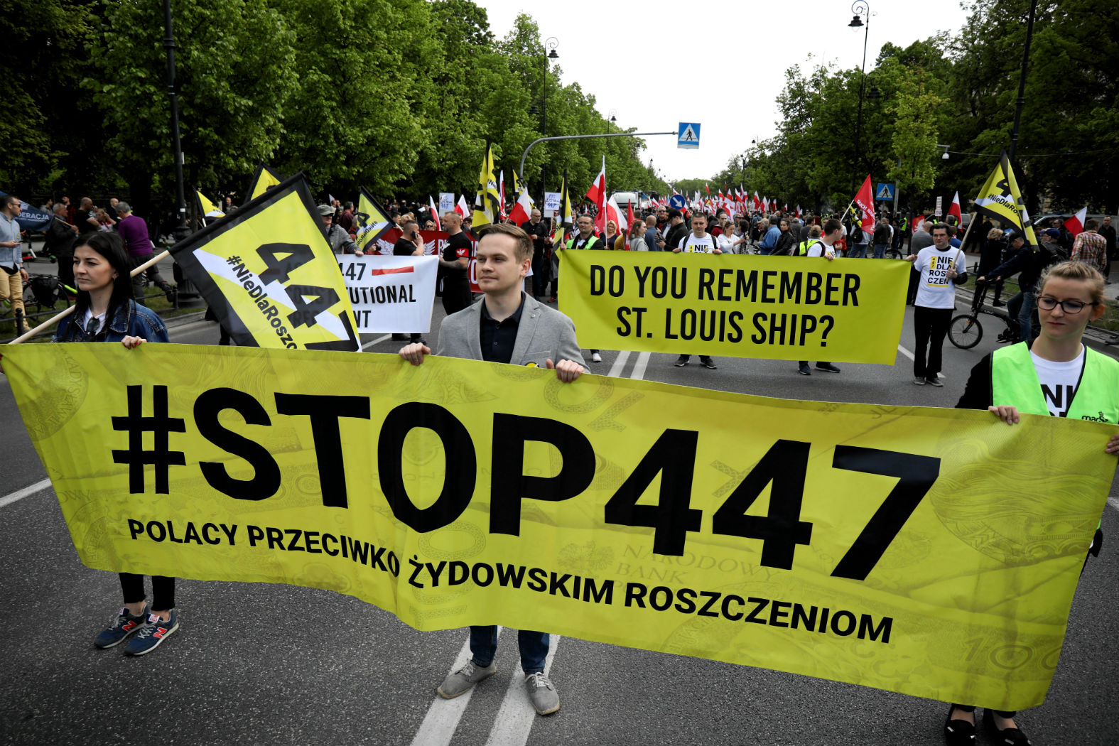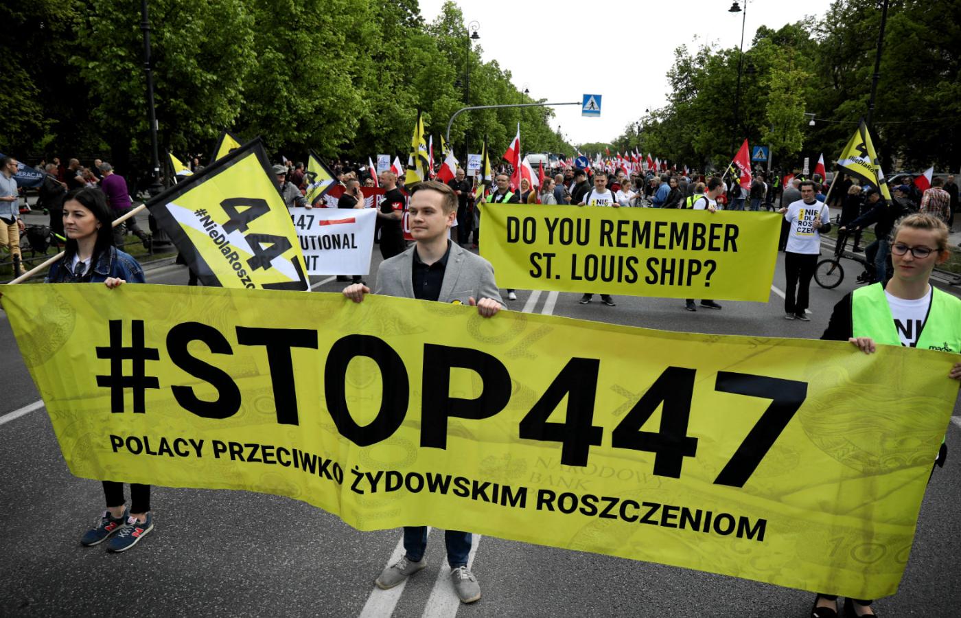 Według organizatorów marszu „Stop 447” w słoneczne sobotnie popołudnie przed kancelarią premiera zebrało się 20 tys. osób. Na takie deklaracje zawsze trzeba brać pewną poprawkę, można jednak spokojnie założyć, że stojącemu za demonstracją stowarzyszeniu Marsz Niepodległości udało się zebrać co najmniej kilka tysięcy osób. Wiek był zróżnicowany, płeć – jak to zwykle bywa na wydarzeniach organizowanych przez skrajną prawicę – zazwyczaj męska. Za sceną trwała zbiórka podpisów pod projektem „Stop pedofilii” (tak naprawdę chodzi o zakaz edukacji seksualnej). Tu ktoś przemknął w koszulce „Nie przepraszam za Jedwabne”, tam grupka mężczyzn pod flagą amerykańskiej Konfederacji pokrzyczała „Precz z żydowską okupacją”. W większości przeciw oddawaniu mienia pożydowskiego przyszli zaprotestować „normalsi”. Pytani o przyczyny uczestnictwa, mówią o chęci wymuszenia na rządzie jasnych deklaracji w tej sprawie i sceptycyzmie co do jego zamiarów.
