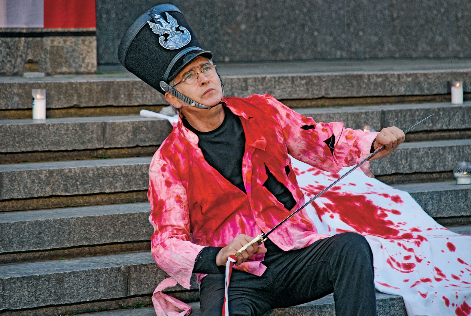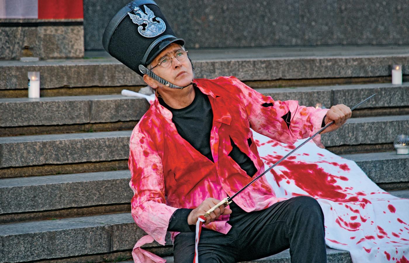 Zamiast, jak kiedyś, spędzać czas z wnukami, daje się zawieźć autem komuś zaprzyjaźnionemu albo wsiada w pociąg. Jedzie w Polskę w sprawie Europy. Grażyna Marzec, aktorka teatralna, matka ich córki, osobiście pozbierała prześcieradła od sąsiadów i poskładała w kostki. Umazane czerwoną farbą będą krwawymi całunami – scenografią do kolejnego spektaklu, granego na improwizowanej scenie na ulicy w kolejnym polskim miasteczku. Prócz głębokiego przekonania, że trzeba grać, aktor wędrujący musi mieć własną scenografię.