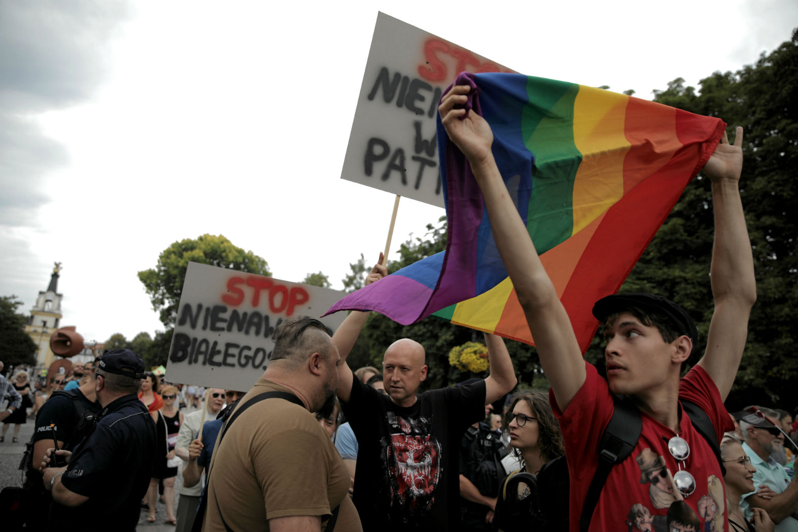 O dyskryminacji katolików sporo mówiło też kilka osób towarzyszących ultraprawicowemu blogerowi Marcinowi Roli. Ci próbowali się wmieszać w wiec przeciw przemocy i dyskutować z jego uczestnikami. Byli przyjmowani raczej życzliwie. Potężny mężczyzna z brodą, w koszulce z orłem i tęczową flagą zarzuconą na ramiona, przedstawiający się jako PKS – Polak, katolik, socjalista, wciąż wyciągał do nich rękę.