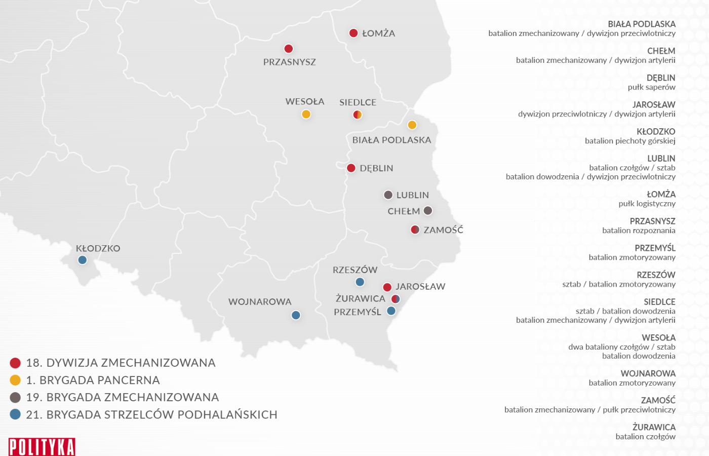 To nie znaczy, że byłe formacje 1. dywizji nie wejdą w skład nowej – tak będzie w przypadku brygady pancernej z Wesołej, brygady strzelców podhalańskich z Rzeszowa czy odtwarzanej w Lublinie brygady zmechanizowanej. Ale już garnizon Biała Podlaska zostanie przekształcony całkowicie, nowa jednostka powstanie w Nowej Dębie, zmieni się też znaczenie Przasnysza, Dęblina, Zamościa czy Łomży na wojskowej mapie Polski.