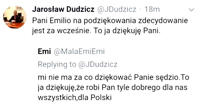 Onet opublikował dziś twitterową korespondencję wiceministra Piebiaka z „Emilią”, kobietą prowadzącą akcję oczerniania sędziów. Z kolei Marek Tatała, ekspert Forum Obywatelskiego Rozwoju, ujawnił na Twitterze wymianę zdań między „Emilią” a wiceprzewodniczącym neo-KRS Jarosławem Dudziczem. Ta wymiana sugeruje, że sędzia Dudzicz też mógł przekazywać „Emilii” dane potrzebne do akcji dyfamacyjnej: „Pani Emilio, na podziękowania zdecydowanie jest za wcześnie. To ja dziękuję Pani”. MalaEmiEmi: „Mi nie ma za co dziękować Panie sędzio. To ja dziękuję, że robi Pan tyle dobrego dla nas wszystkich, dla Polski”.