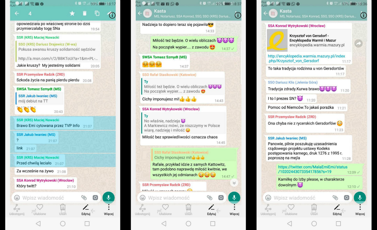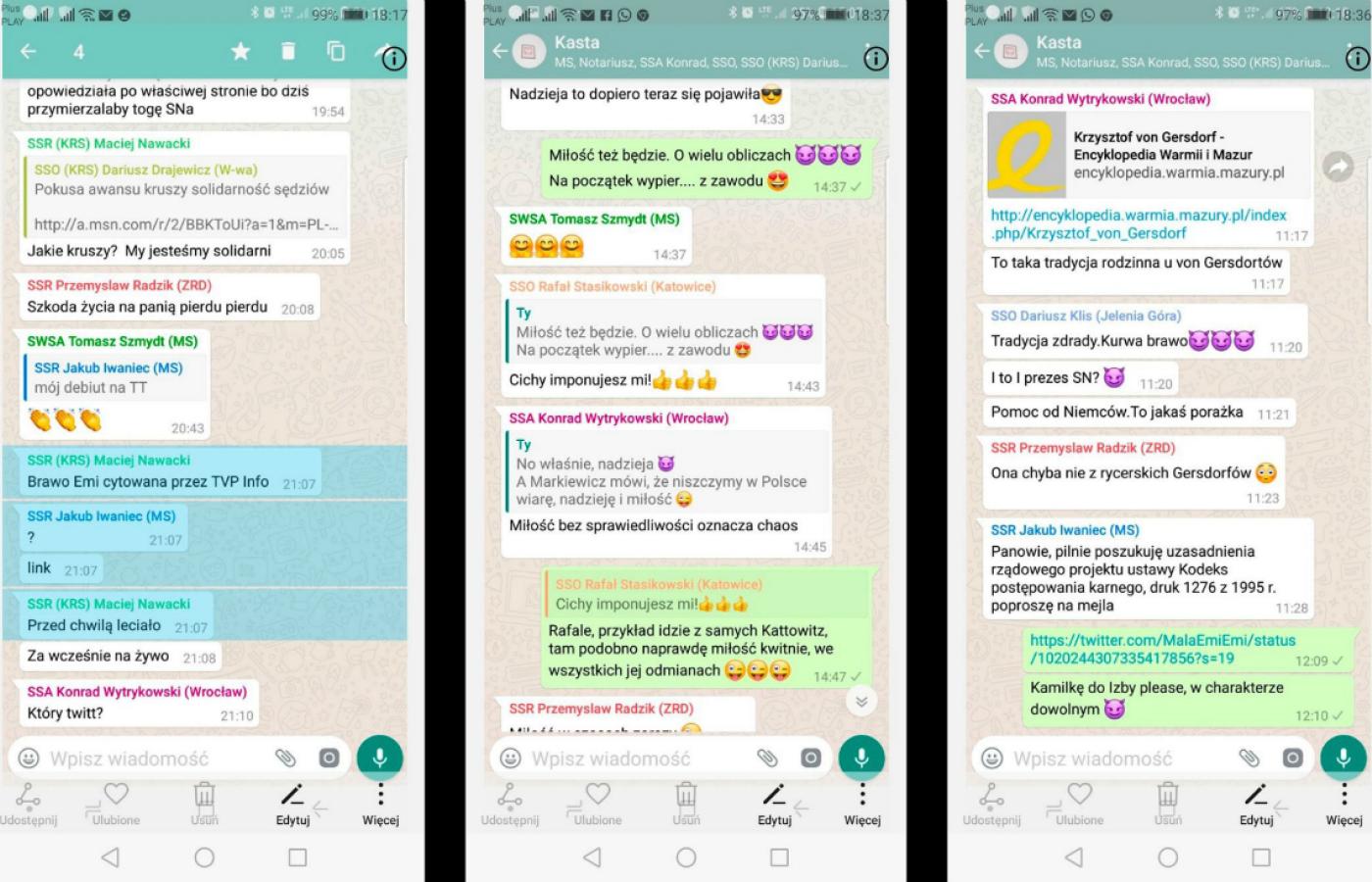 Tajna grupa „Kasta” powstała pod koniec 2016 r. na WhatsAppie. Przewodził jej „Herszt” (użytkownik o nicku „MS II”), czyli wiceminister Łukasz Piebiak. W jej skład wchodzili także Jakub Iwaniec, Tomasz Szmydt, szef wydziału prawnego neo-KRS, dwaj zastępcy głównego rzecznika dyscyplinarnego sędziów – Przemysław Radzik (na grupie „Rzeźnik”) i Michał Lasota, sędziowie neo-KRS – jej wiceszef Dariusz Drajewicz, Jarosław Dudzicz i Maciej Nawacki, sędziowie Konrad Wytrykowski z Izby Dyscyplinarnej Sądu Najwyższego, były prezes Sądu Okręgowego w Gliwicach Arkadiusz Cichocki (dziś delegowany do Sądu Apelacyjnego w Katowicach), wiceprezes Sądu Okręgowego w Gliwicach Ireneusz Wiliczkiewicz, były prezes Sądu Okręgowego w Katowicach Rafał Stasikowski (dziś w Naczelnym Sądzie Administracyjnym), prezes Sądu Okręgowego w Jeleniej Górze Dariusz Kliś i inni jej członkowie.