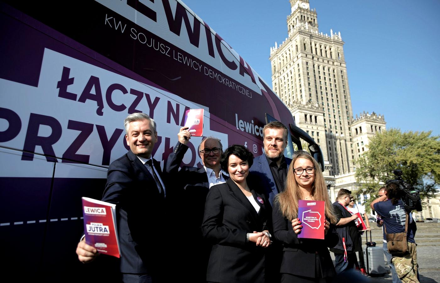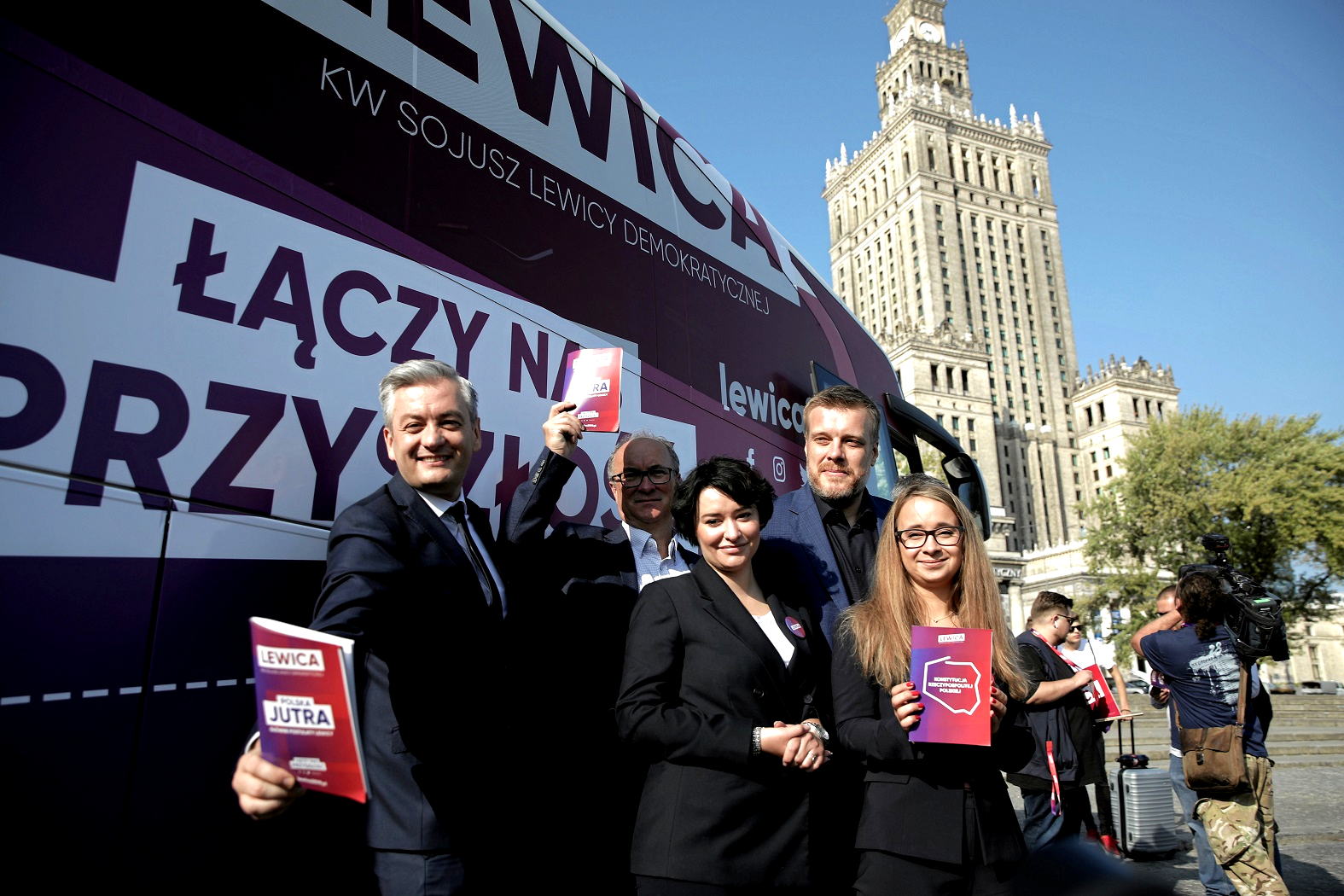 Piątek 13 września, godz. 9:00, dzień ładny, niebo słoneczne. Równo miesiąc przed wyborami z warszawskiego pl. Defilad w objazd po Polsce wyrusza Lewicobus. Pod fioletowym busem, oklejonym zdjęciami z konwencji Lewicy i hasłami „świeckie państwo”, „sprawiedliwe sądy” czy „niższy ZUS”, pojawiają się przewodniczący SLD Włodzimierz Czarzasty, szef Wiosny i sztabu Lewicy Robert Biedroń oraz lider (formalnie jeden z dziewięciorga) Razem Adrian Zandberg. Obok nich rzeczniczka SLD Anna Maria Żukowska, była wicemarszałkini Sejmu Wanda Nowicka i członkini zarządu Razem Marcelina Zawisza.