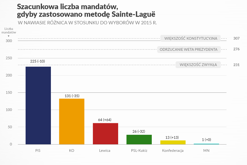 Po 2001 r. Polska wróciła do systemu d′Hondta i używano go we wszystkich kolejnych wyborach. Jeśli jednak 13 października użyto by ponownie metody Sainte-Laguë, to znacząco zmieniłby się wynik wyborów: PiS uzyskałby 225 mandatów i zabrakłoby mu sześciu do samodzielnych rządów.