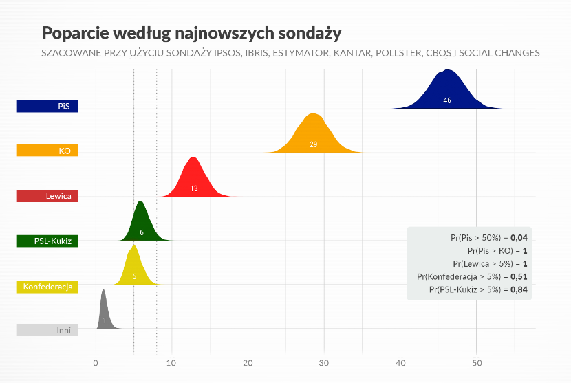 Tak jak poprzednio poziomy poparcia sugerują powstanie cztero- lub pięciopartyjnego Sejmu, w którym PiS – z 249 mandatami – będzie miał komfortową, samodzielną większość. Koalicja Obywatelska znalazłaby się na drugim miejscu ze 141 posłami przed Lewicą (49 posłów) i PSL-Kukiz (17 posłów). To, czy jakiekolwiek mandaty przypadną Konfederacji, nie jest na tym etapie jasne, ponieważ balansuje ona na granicy 5-proc. progu poparcia. Ale gdyby udało jej się go przekroczyć, to najpewniej uzyskałaby trzy miejsca w nowym parlamencie. Mniejszość niemiecka, która nie podlega temu wymogowi, wprowadzi jednego posła.