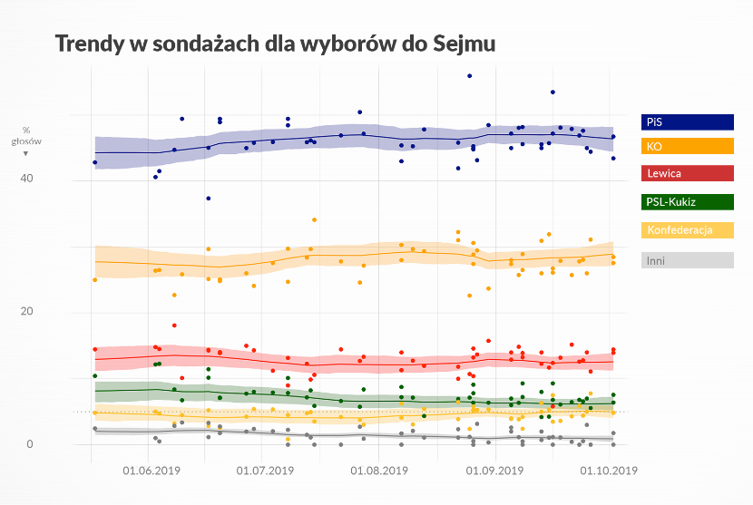 Na tydzień przed wyborami parlamentarnymi w sondażach wciąż nie ma praktycznie żadnych zmian. W siedmiu badaniach opublikowanych w ciągu ostatnich dwóch tygodni poparcie dla PiS wahało się między 43 a 48 proc., ale średnia pozostaje stabilna (46 proc.). Podobnie poparcie dla Koalicji Obywatelskiej było zmienne – od 26 do 31 proc. – ale średnia utrzymywała się niewzruszenie na poziomie 29 proc.