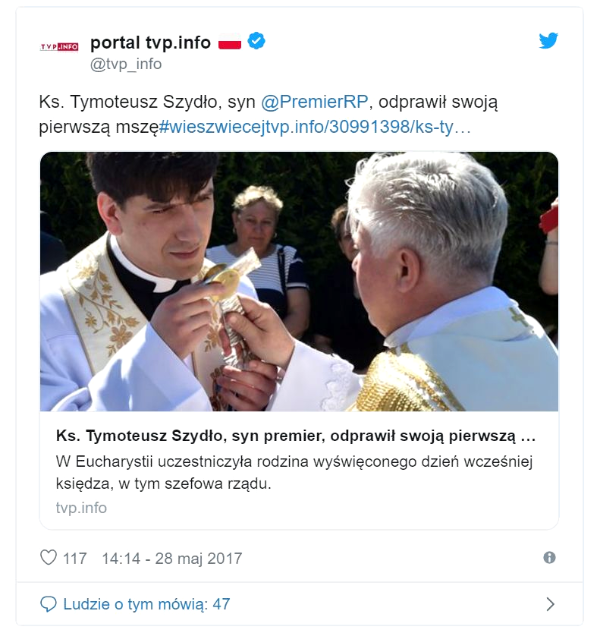 Kiedy dwa lata temu świeżo upieczony absolwent seminarium duchownego Tymoteusz Szydło przyjmował święcenia kapłańskie, jego rodzina chwaliła się tym przed całą Polską. W świetle kamer brylowała zwłaszcza dumna mama Beata, pełniącą wówczas funkcję premiera. Wywiadów udzielała tuż po uroczystości w katedrze w Bielsku-Białej. A gdy w rodzinnej parafii młody kapłan odprawił prymicyjną mszę, ochoczo przedstawiała latorośl dziennikarzom, pozowała z nim do zdjęć i opowiadała o jego religijności.