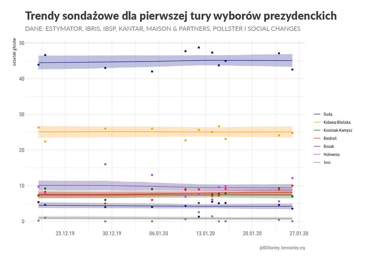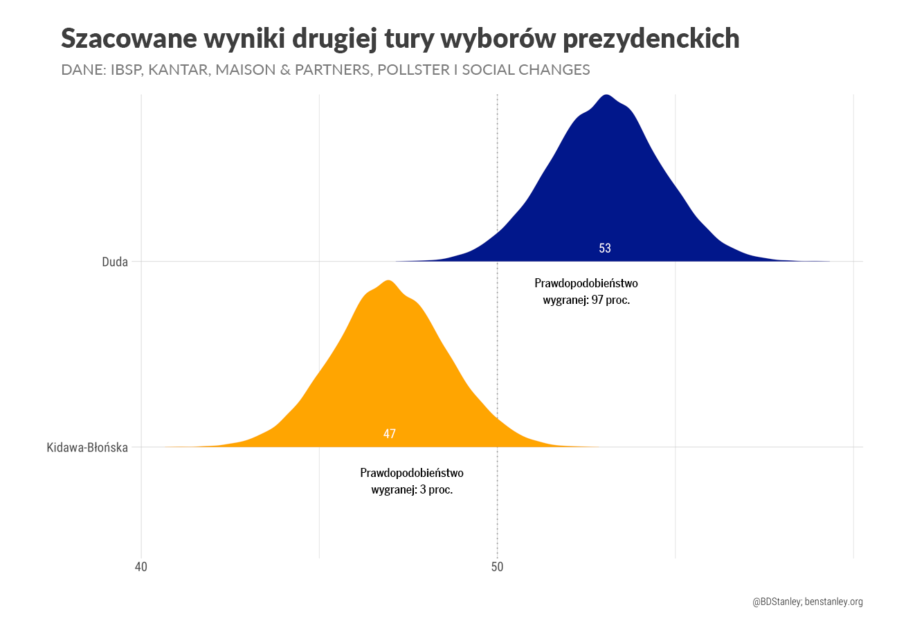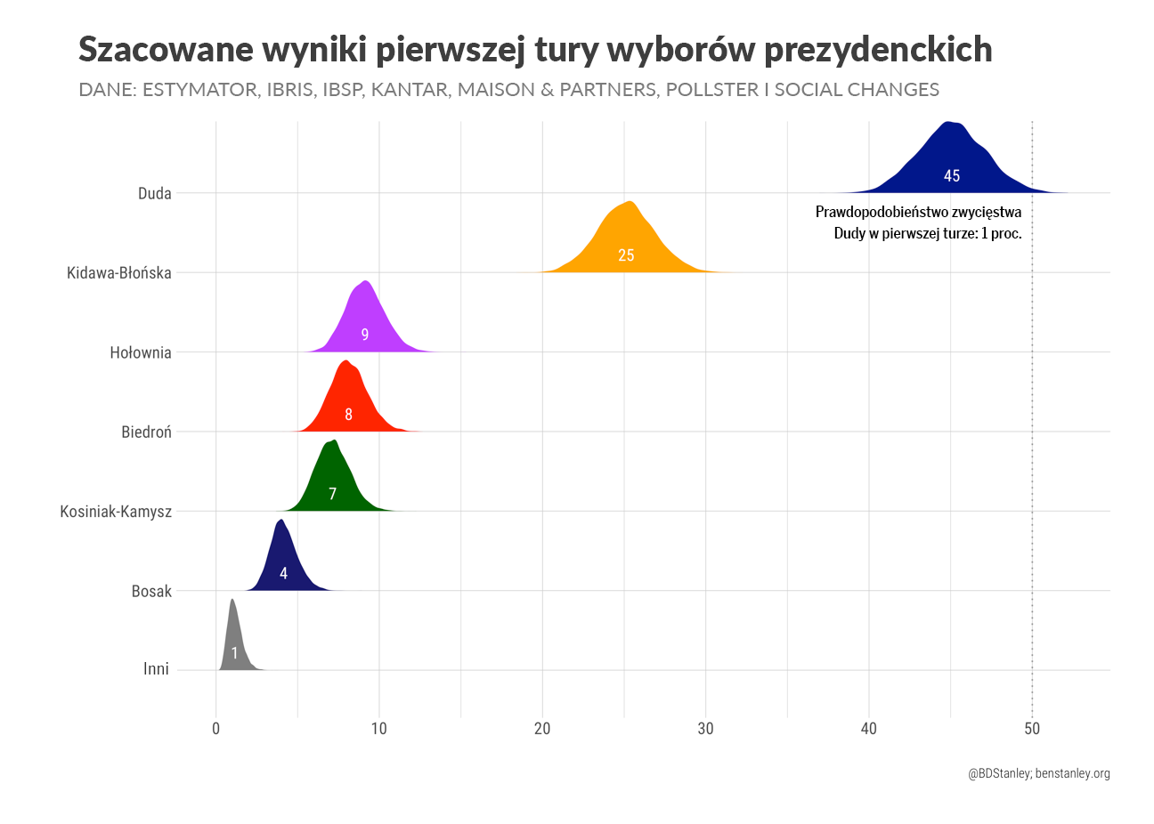 Ben Stanley – brytyjski politolog mieszkający w Polsce, profesor Uniwersytetu SWPS. Przy wyliczeniach szacowanego poparcia kandydatów na prezydenta używa modelu statystycznego, którego prekursorem był amerykańsko-australijski politolog prof. Simon Jackman. Pod uwagę wziął sondaże Estymator, IBRiS, IBSP, Kantar, Maison&Partners, Pollster i Social Changes.