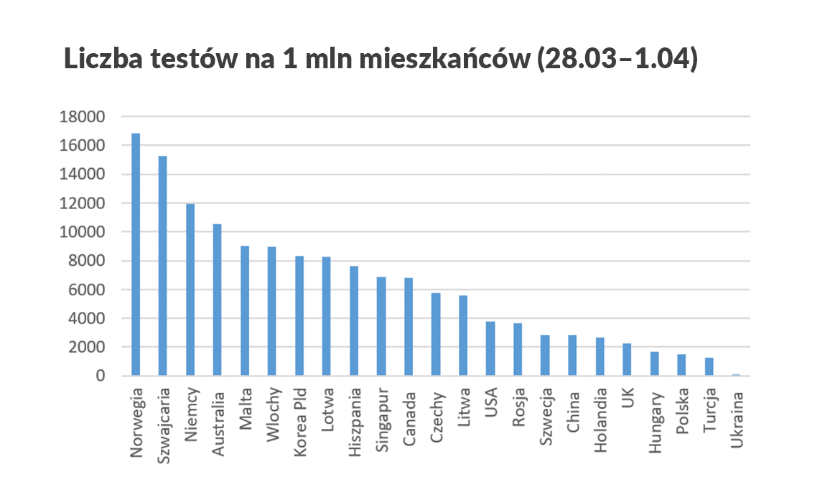 Eksperci WHO podkreślają, że najważniejszą bronią w wojnie z wirusem są testy i izolacja zakażonych. To samo pokazują doświadczenia krajów azjatyckich. Niemcy właśnie wdrażają system powszechnych testów oraz izolacji i elektronicznego monitorowania zakażonych. A co robi Polska? Poniższa tabela nr 2 pokazuje liczbę testów na 1 mln mieszkańców w wybranych krajach.