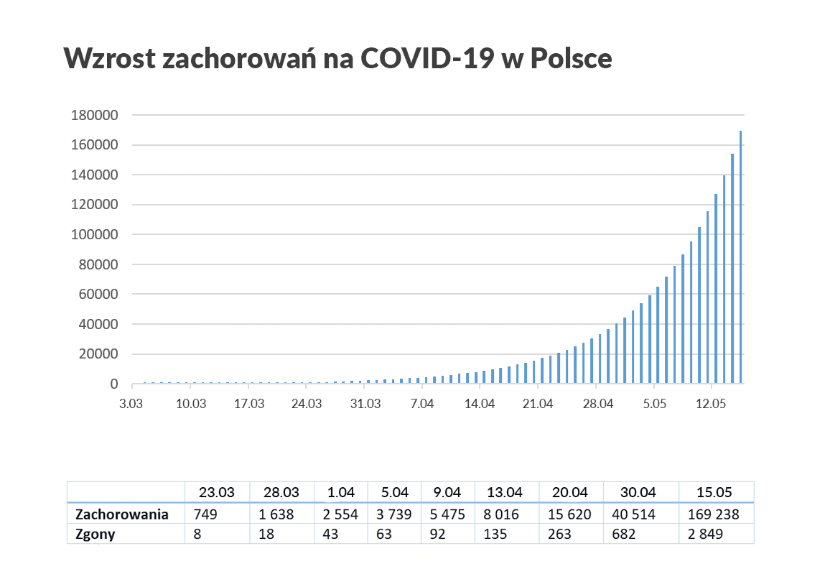 Do 1 kwietnia w Polsce potwierdzono zakażenie SARS-CoV-2 u 2554 osób, z czego 43 zmarły. Dzienny wzrost zachorowań w ostatnich dniach wynosił 10–19 proc., liczba chorych podwaja się co cztery–osiem dni. Poniższy rysunek i tabela przedstawiają wzrost liczby zachorowań na Covid-19 w Polsce oraz prognozę zachorowań i śmiertelności w oparciu o wskaźnik przyrostu dziennego 10 proc. (najniższy notowany ostatnio).