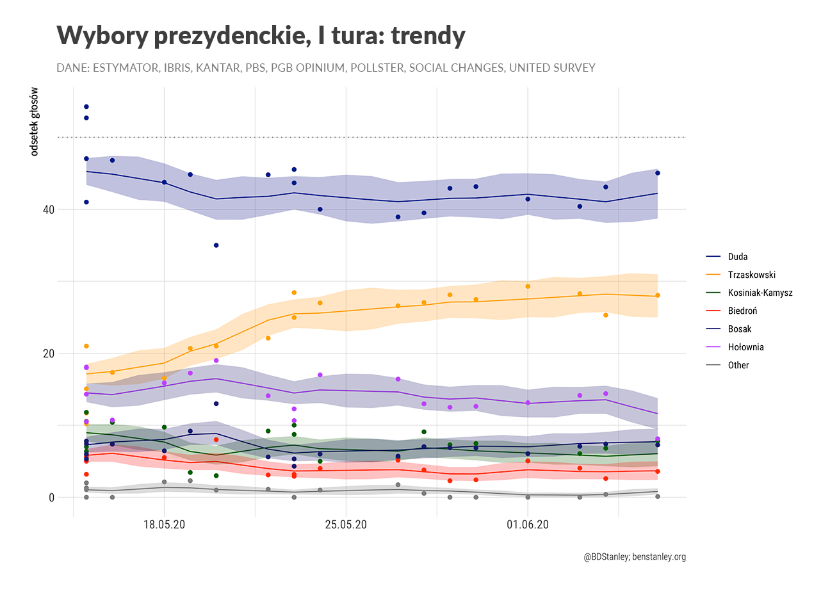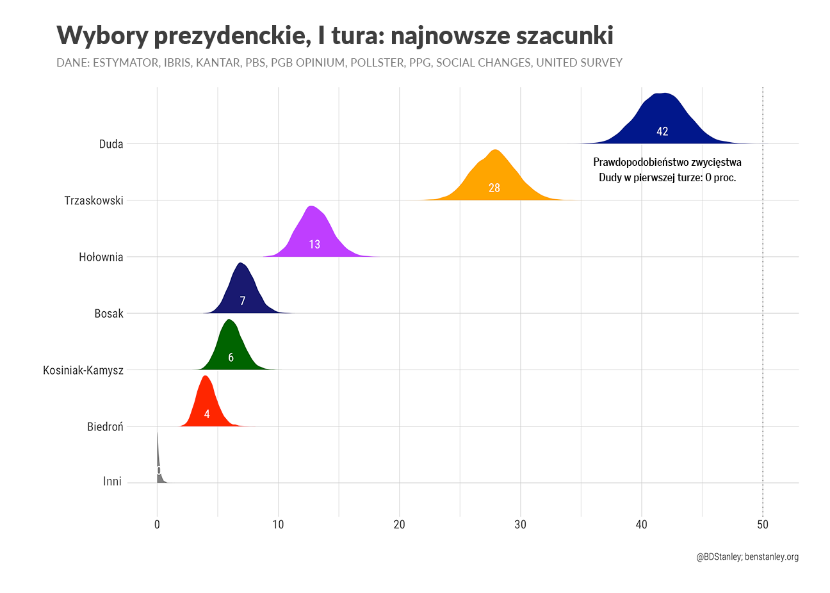 Ben Stanley – brytyjski politolog mieszkający w Polsce, profesor Uniwersytetu SWPS. Przy wyliczeniach szacowanego poparcia kandydatów na prezydenta używa modelu statystycznego, którego prekursorem był amerykańsko-australijski politolog prof. Simon Jackman. Pod uwagę wziął sondaże Estymator, IBRiS, IBSP, Kantar, Maison&Partners, Pollster i Social Changes.