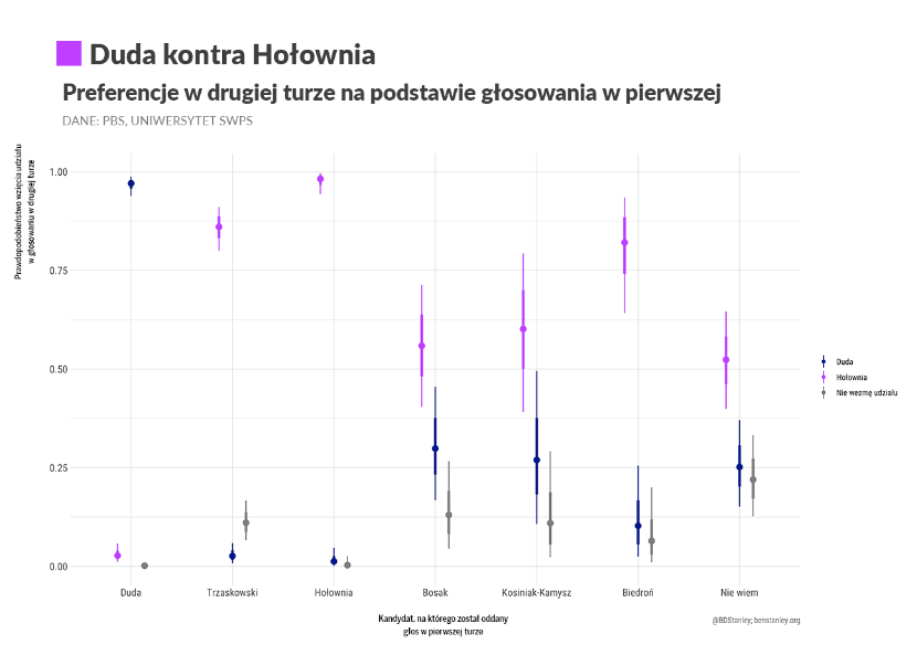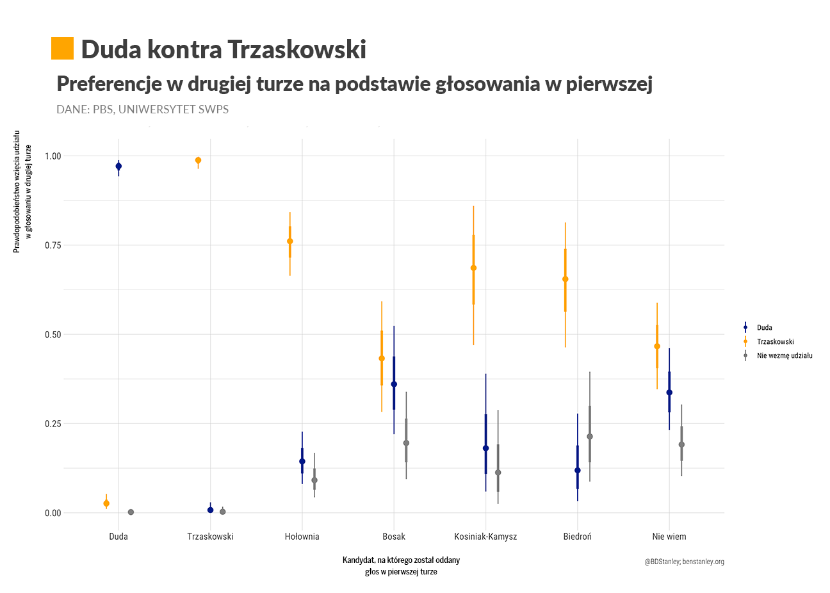 W razie bezpośredniego starcia z Trzaskowskim Duda zachowałby zdecydowaną większość głosów z pierwszej tury, ale miałby problemy z przyciągnięciem głosów od innych rywali. Obecnie istnieje jedynie 36 proc. szans, że przeciętny wyborca Bosaka poparłby urzędującego prezydenta. Duda może liczyć też na 34 proc. wśród tych, którzy wciąż są niezdecydowani.