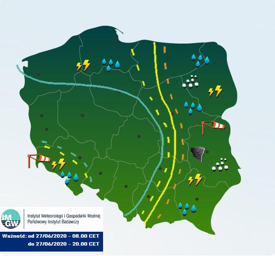 W sobotę Instytut Meteorologii i Gospodarki Wodnej wydał ostrzeżenia drugiego stopnia przed burzami z gradem dla województwa podkarpackiego i lubelskiego oraz pierwszego stopnia dla województw: pomorskiego, mazowieckiego, warmińsko-mazurskiego, podlaskiego, małopolskiego, świętokrzyskiego i części woj. kujawsko-pomorskiego, co oznacza, że niebezpieczne zjawiska meteorologiczne mogą przynieść zagrożenie życia i zdrowia, a także straty materialne.