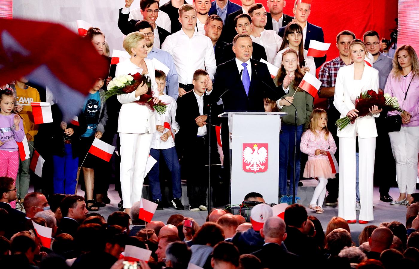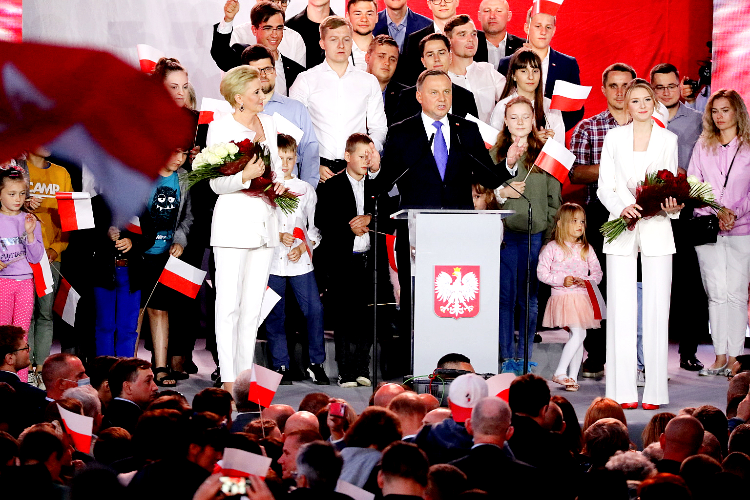 Tuż przed ogłoszeniem wyniku wyborów prowadzący zagrzewał sympatyków PiS okrzykami: „Damy radę!”. Większość zebranych wymachiwała biało-czerwonymi flagami. Andrzejowi Dudzie towarzyszyła żona Agata Kornhauser-Duda i córka Kinga, obie w szykownych białych garniturach.