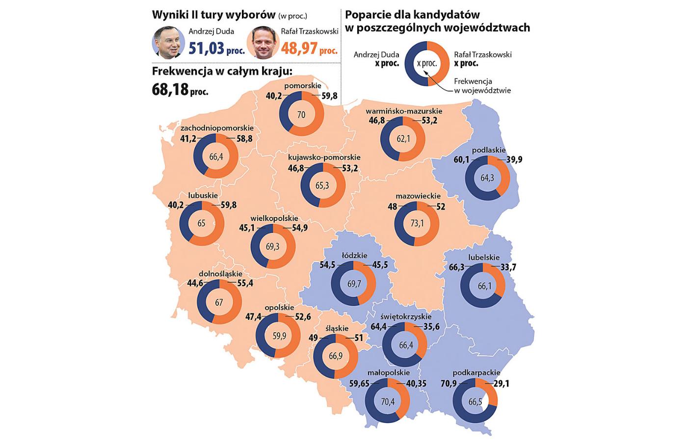 Najbardziej zmobilizowani byli mieszkańcy woj. mazowieckiego (frekwencja 73,1 proc.) i małopolskiego (70,4 proc.), najmniej – opolskiego (59,9 proc.). Na Mazowszu obaj kandydaci szli łeb w łeb – ostatecznie wygrał Trzaskowski (52 proc.). Podobna sytuacja była na Śląsku, ale i tu szala przechyliła się na korzyść Trzaskowskiego (51 proc.). Andrzej Duda był zdecydowanym zwycięzcą na Podkarpaciu, gdzie zagłosowało na niego 70,9 proc. wyborców. Natomiast Rafał Trzaskowski najlepiej poradził sobie na Pomorzu i w Lubuskiem (w obu 59,8 proc.).