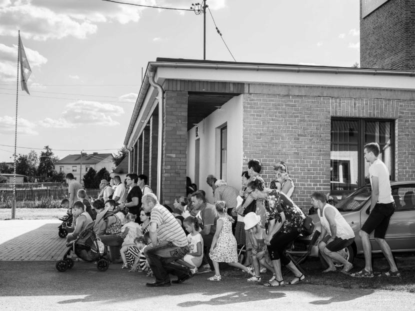 Poszukiwanie wspólnoty zajęło autorom wiele czasu. Ale się uparli. Ostatecznie odnaleźli ją w Kadłubie Wolnym w województwie opolskim. W 1605 r. wieś za 2 tys. talarów wykupiła się z poddaństwa. Kupili własną wolność, ale i otaczającą ich ziemię. Mieli 400 lat, żeby nauczyć się kierować własną wolnością, ale też wspólną przestrzenią, w której każde drzewo jest każdego, bo majątek podzielony jest procentowo. Wspólna przestrzeń stworzyła wspólnotę. Ciągłość ją zakonserwowała. Ze zdjęcia trudno to wyczytać. Jest w tej książce kilka zdjęć, w których wspólnota wydaje się silniejsza. Wspólnota mieczy Wojowników Maryi, wspólnota skandującego tłumu. Tylko czy bycie przeciw czemuś tworzy wspólnotę, czy tylko wspólne zdjęcie? Zdjęcie z Kadłuba Wielkiego to opowieść o wspólnocie, która niejako tworzy się na naszych oczach. Do tych, którzy już klęczą, dołączają kolejni. Zatrzymani w ruchu. Klęczący, ale wolni. Bardzo to przewrotne, jak cała ta książka.