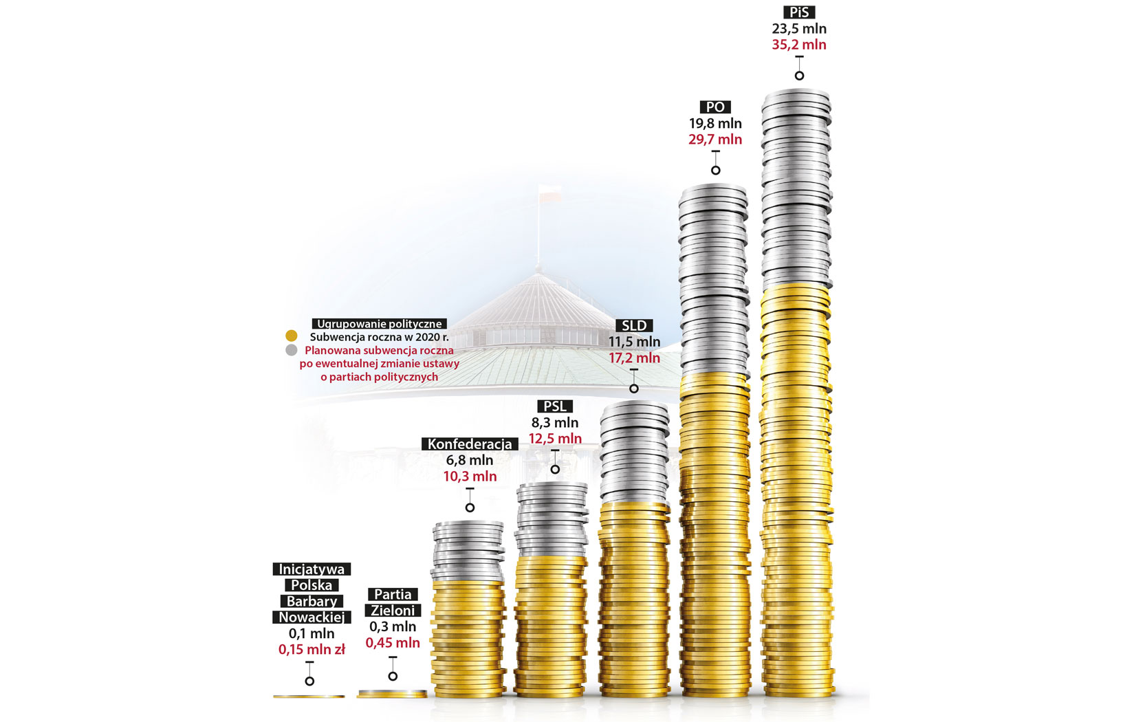 W ustawie napisanej przez nieustalonych do dziś autorów o podniesieniu wynagrodzeń politykom najpoważniejsza regulacja ustrojowa kryła się w skomplikowanym wzorze, a oznaczała po prostu podniesienie subwencji dla partii o połowę w stosunku do tego, co dziś dostają. O ile podwyżki pensji ostatecznie mają wylądować w koszu, to obóz władzy jeszcze zastanawia się nad zwiększeniem subwencji. Po ostatnich wyborach parlamentarnych pieniądze podatników na działalność statutową przyznano: PiS – 23,5 mln zł, PO – 19,8 mln, SLD – 11,5 mln, PSL – 8,3 mln, Konfederacja – 6,8 mln, Partia Zieloni – 303 tys. i Inicjatywa Polska Barbary Nowackiej – 101 tys. zł. Rocznie to 70,4 mln zł, a miało być o 35 mln więcej.