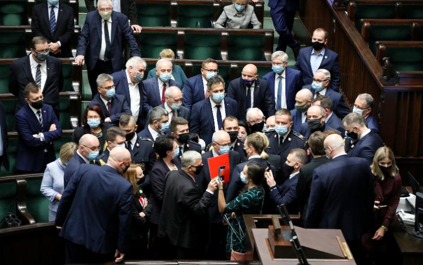 Na mównicę weszła posłanka Joanna Scheuring-Wielgus i złożyła wniosek o włączenie do porządku obrad projektu liberalizacji prawa aborcyjnego autorstwa Lewicy. Dołączyły do niej posłanki Lewicy z transparentami „Legalna aborcja”. Podeszły do Jarosława Kaczyńskiego, krzyczały „Hańba” i „To jest wojna”. Dołączyli też posłowie Koalicji Obywatelskiej, a Terlecki wykluczył z obrad posłów KO Klaudię Jachirę i Sławomira Nitrasa.