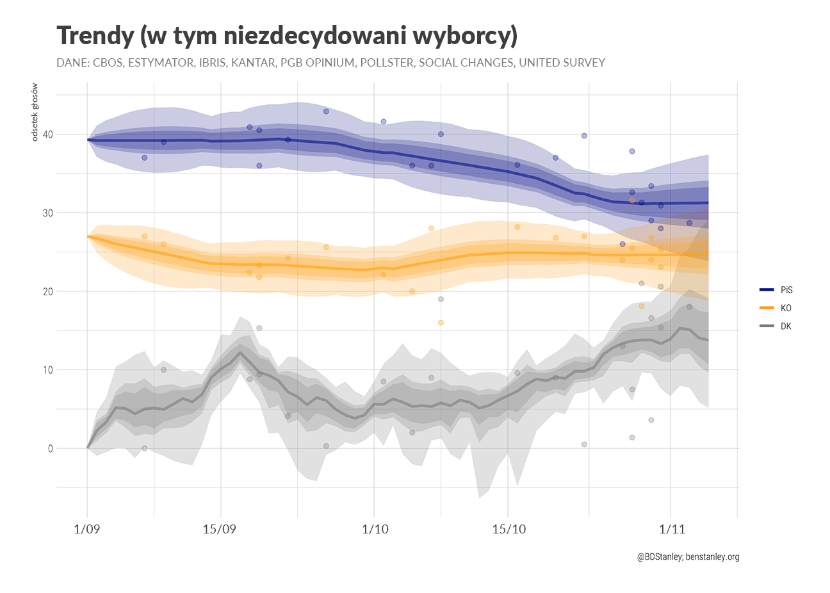 Od kilku lat poparcie dla PiS utrzymuje się na poziomie 40–45 proc., a Koalicja Obywatelska może liczyć na ok. 15 pkt proc. mniej. Rzadko ta różnica jest mniejsza. W żadnym momencie od wyborów 2015 PiS nie lądował w sondażach za opozycją; przynajmniej nie konsekwentnie w kilku kolejnych badaniach, co mogłoby mieć znaczenie w analizie statystycznej. Pozostałe partie utrzymywały się regularnie poniżej progu 15 proc.