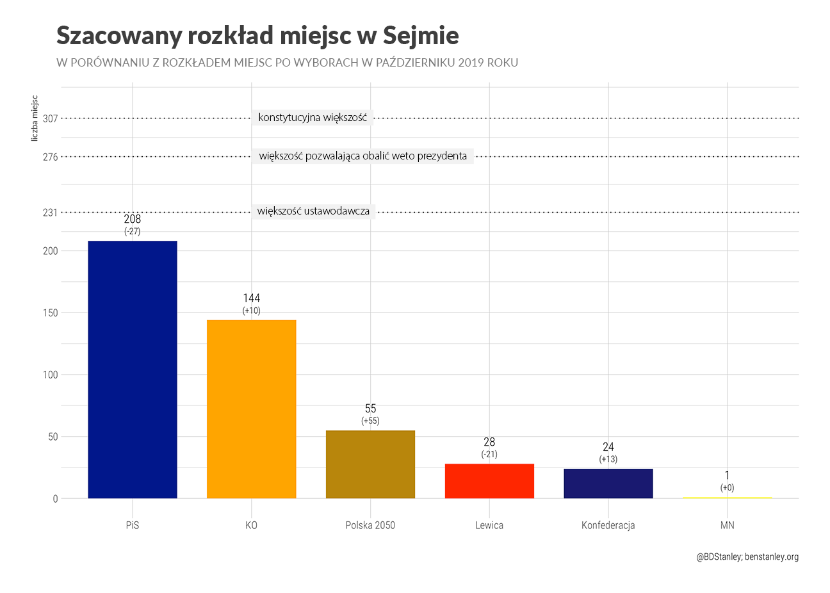 Na podstawie najnowszych wyników i założenia, że poparcie na poziomie okręgów nadal odzwierciedla to, co widzieliśmy w ostatnich wyborach, PiS nie mógłby liczyć w najbliższą niedzielę na uzyskanie samodzielnej większości w Sejmie, zdobywając ledwie 208 mandatów. Oprócz Polski 2050, która wprowadziłaby 55 posłów, najwięcej zyskałyby KO (10 mandatów) oraz Konfederacja (13). Z drugiej strony Lewica straciłaby aż 21 posłów.
