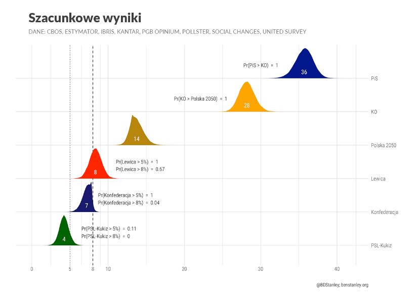 Ben Stanley – brytyjski politolog mieszkający w Polsce, profesor Uniwersytetu SWPS. Przy wyliczeniach szacowanego poparcia dla partii politycznych używa modelu statystycznego, którego prekursorem był amerykańsko-australijski politolog prof. Simon Jackman. Pod uwagę wziął sondaże CBOS, Estymator, IBRiS, IBSP, Indicator, Ipsos, Kantar, Pollster, Social Changes, United Surveys.