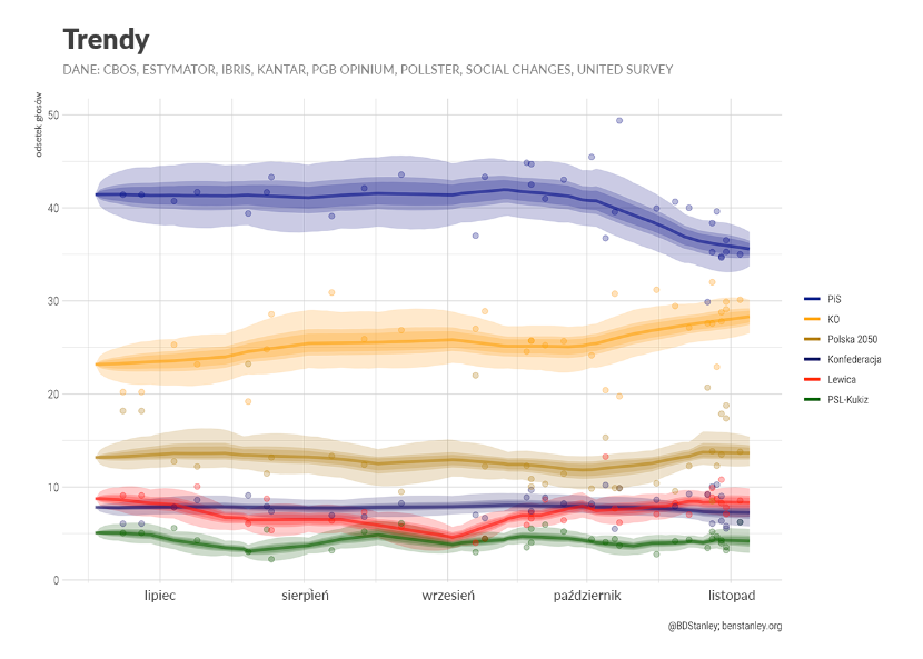 Dominacja PiS opierała się na reputacji tego ugrupowania jako skutecznego rządu o dobrym wyczuciu społecznym dotyczącym tego, jakie są poglądy przeciętnego Kowalskiego. W ostatnich tygodniach oba te atrybuty stanęły pod znakiem zapytania w wyniku niezdolności przewidzenia oraz szybkiego zareagowania na drugą falę koronawirusa oraz wybuchu niekontrolowanych protestów po „wyroku” TK w sprawie aborcji. Co warte odnotowania, ten spadek jest obecny także w sondażach Social Changes i CBOS, zazwyczaj wskazujących wyższe od średniej poparcie dla PiS.