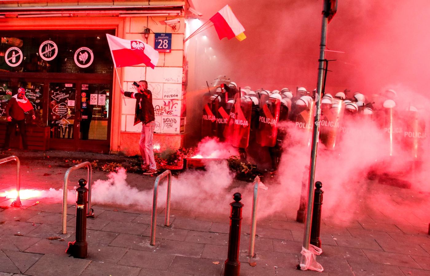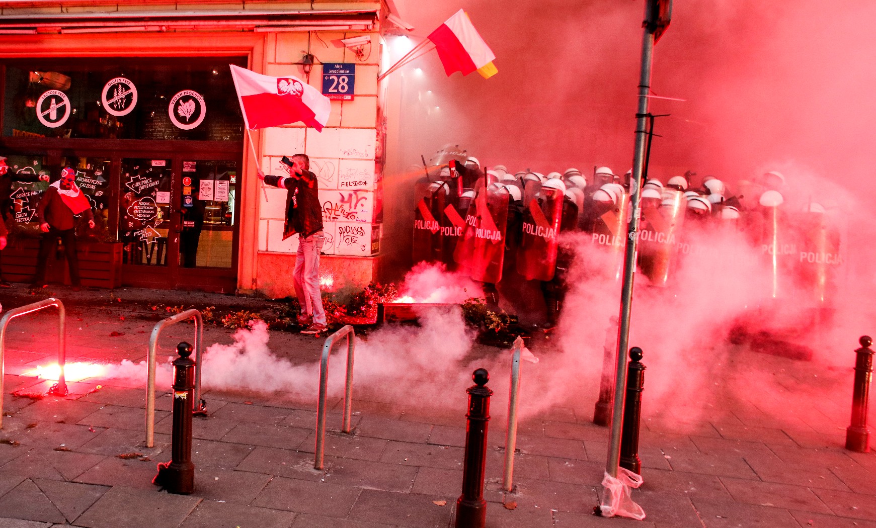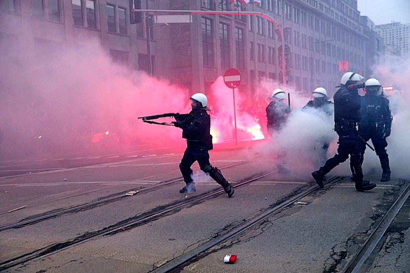 Chwilę później obserwowaliśmy już regularną bitwę o centrum Warszawy. Policjanci próbowali odgrodzić najbardziej agresywnych demonstrantów od reszty, spychając ich na drugą stronę ronda, pod dawny Dom Partii. Momentalnie zmieniła się wtedy demografia marszu. Zdecydowaną większość uczestników stanowili zamaskowani kibole z biało-czerwonymi opaskami na rękach, biało-czerwonymi kominiarkami na głowach, z racami i kamieniami.